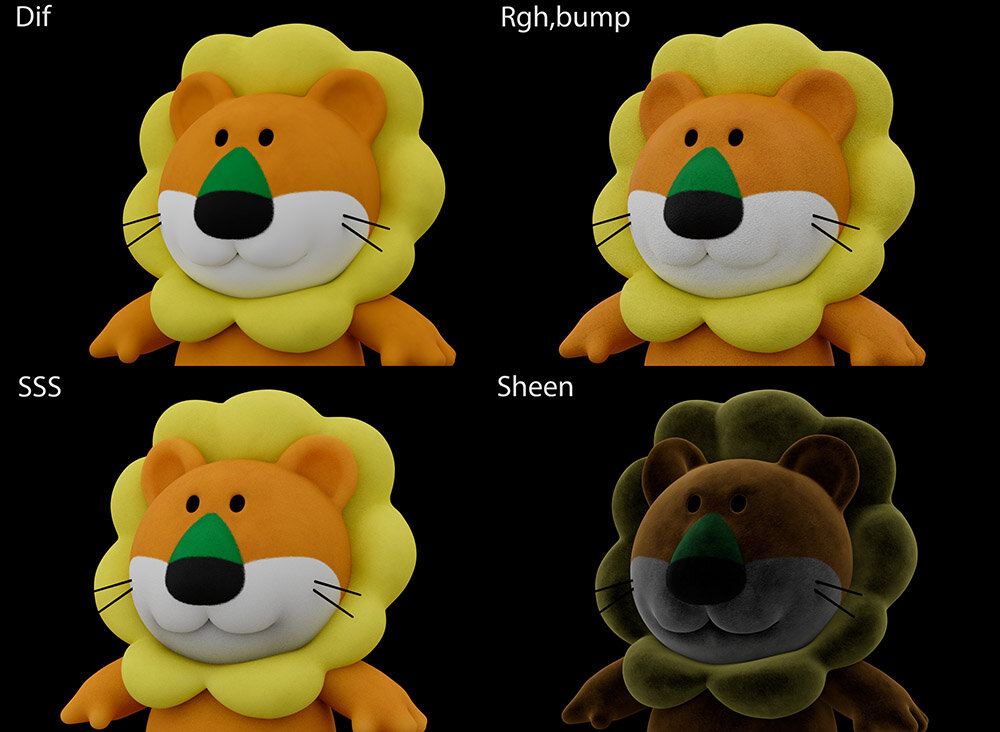 Diffuseテクスチャは、まず単色のベースカラーの上にノイズを重ねることで、ぬいぐるみ特有の毛羽立ちを表現(=凹凸ノイズ)。さらにSubstance 3D PainterのBlur Slope Filterにファーのノイズを加え、 Blurの方向をコントロールして色の境目に毛並み感を出している。全体に重ねた凹凸ノイズをより柔らかくすることも可能だ。