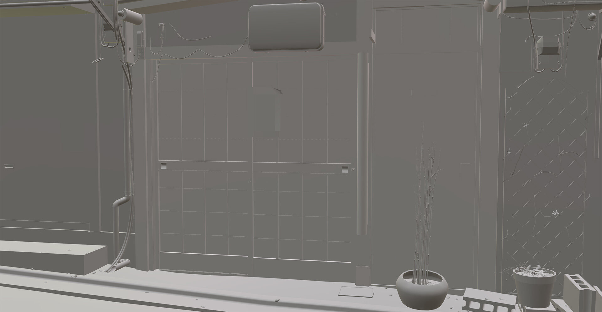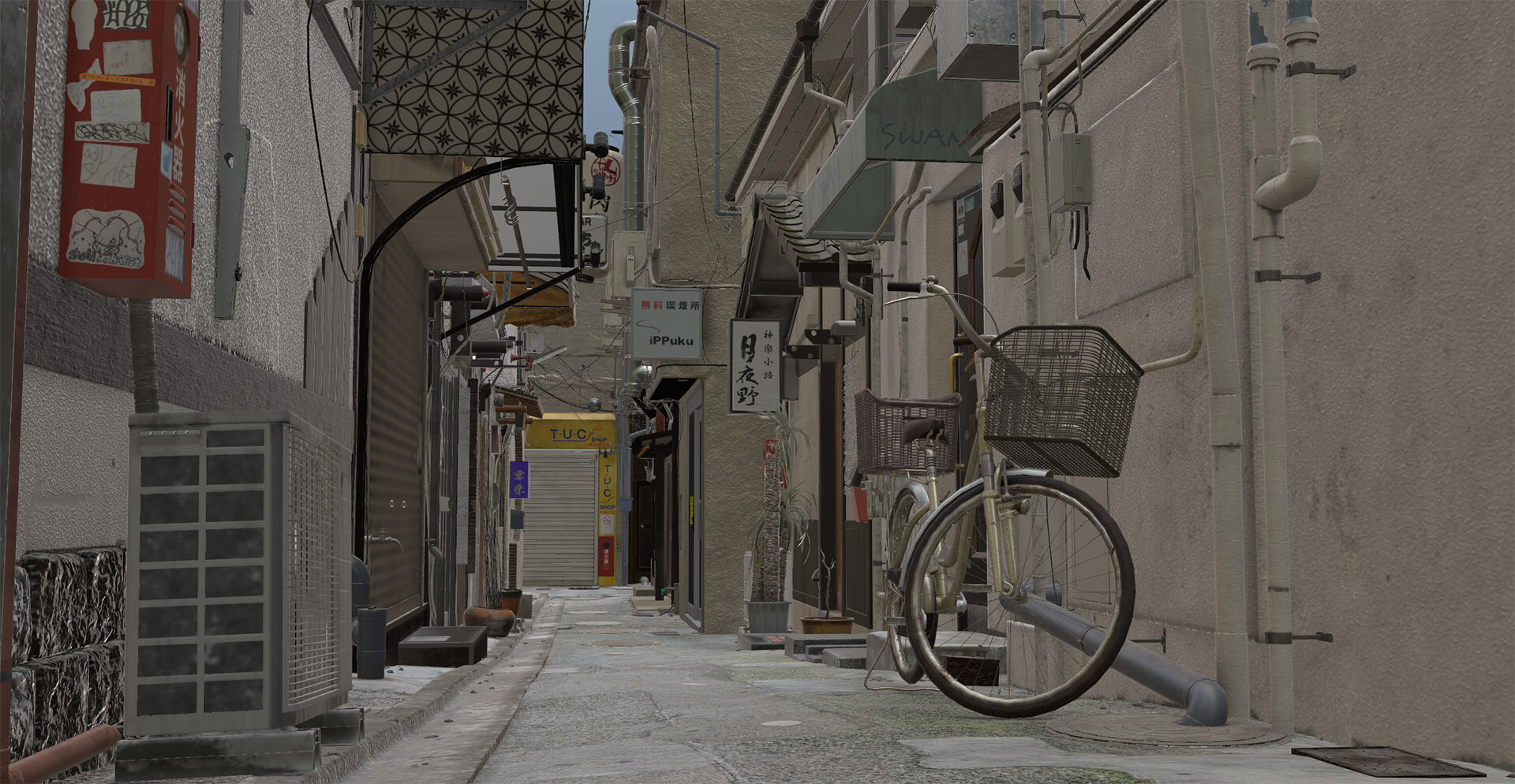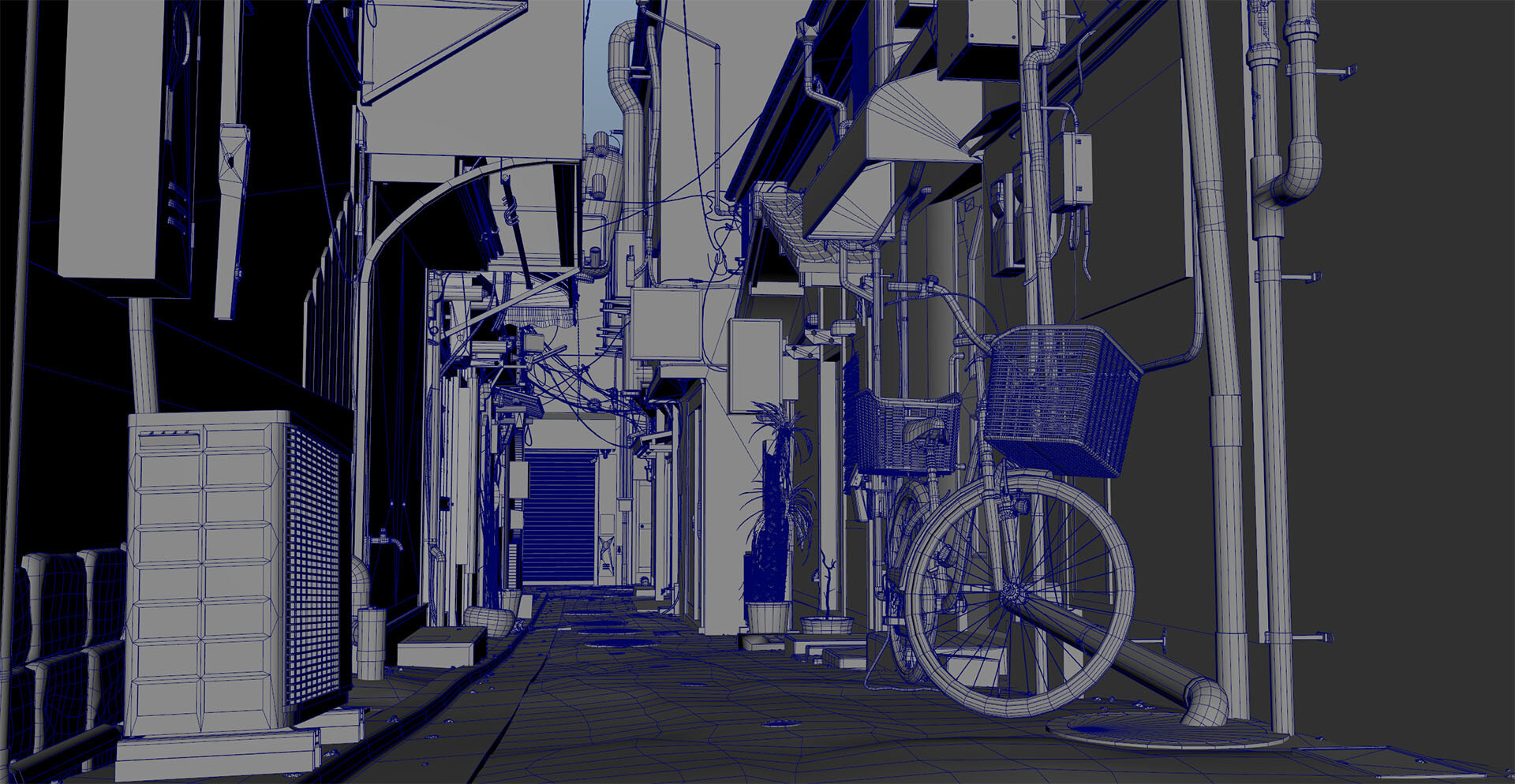 みちくさ横丁は40メートル弱の路地ですが、Mayaシーンは1/10スケールで作成しました。まずは壁面や地面など大きな面積を占める部分からモデリングを始め、室外機や自転車、看板といった特徴的な細か要素へと段階的に進めていきました。