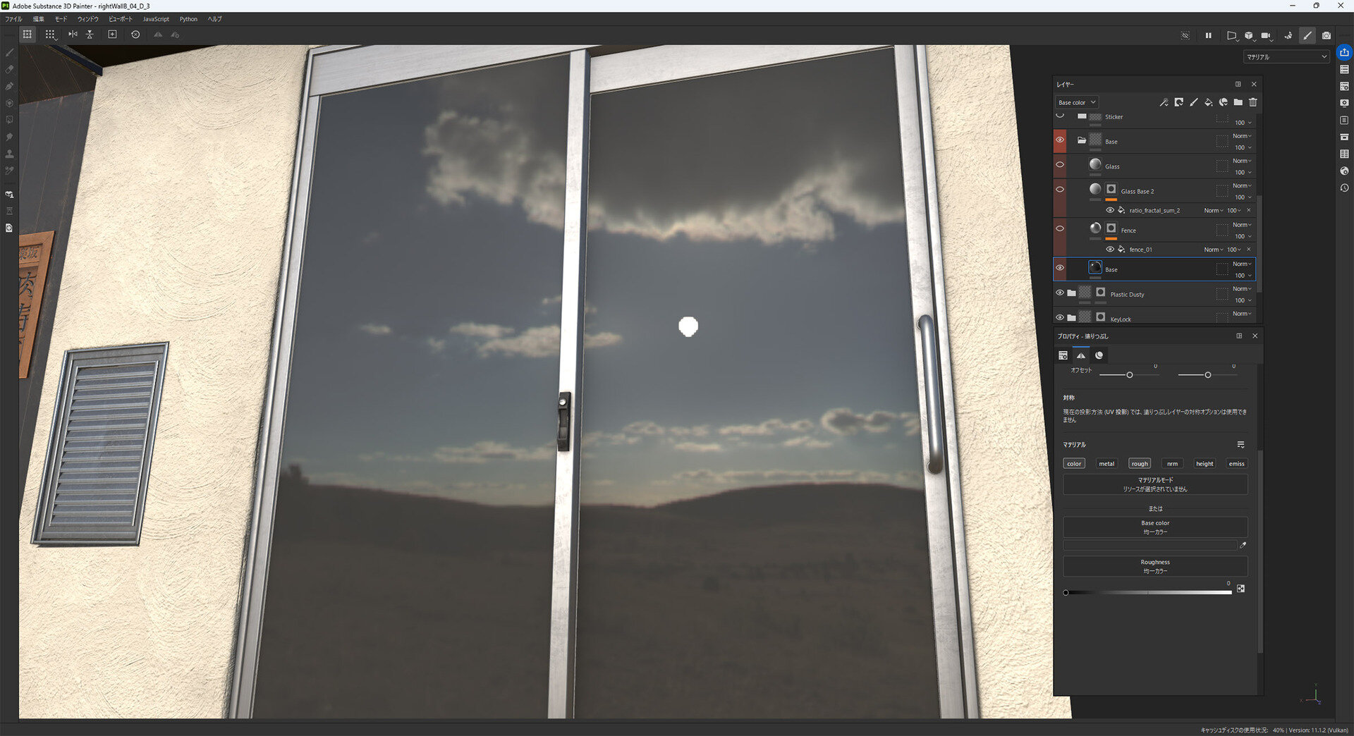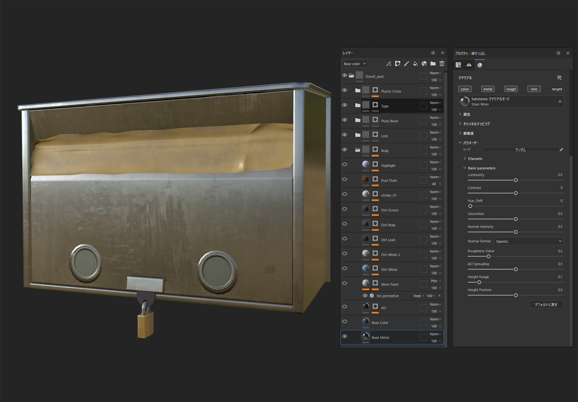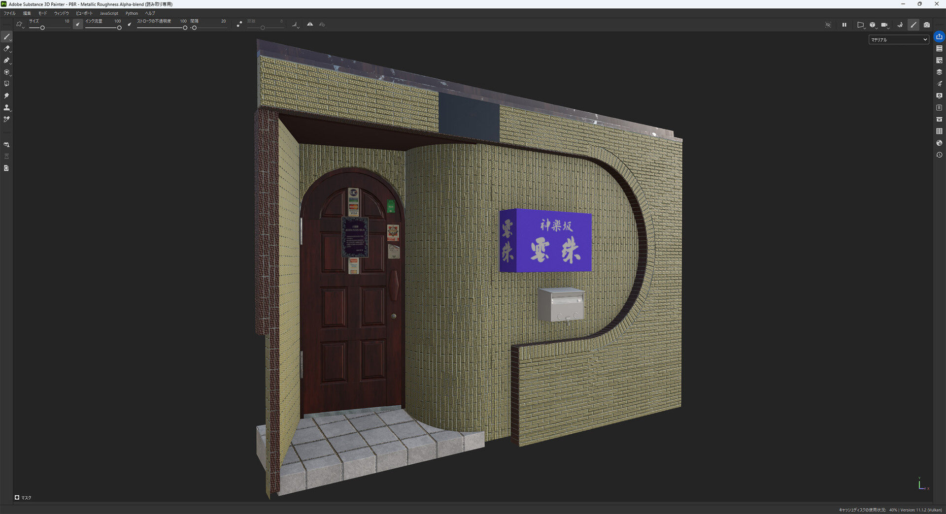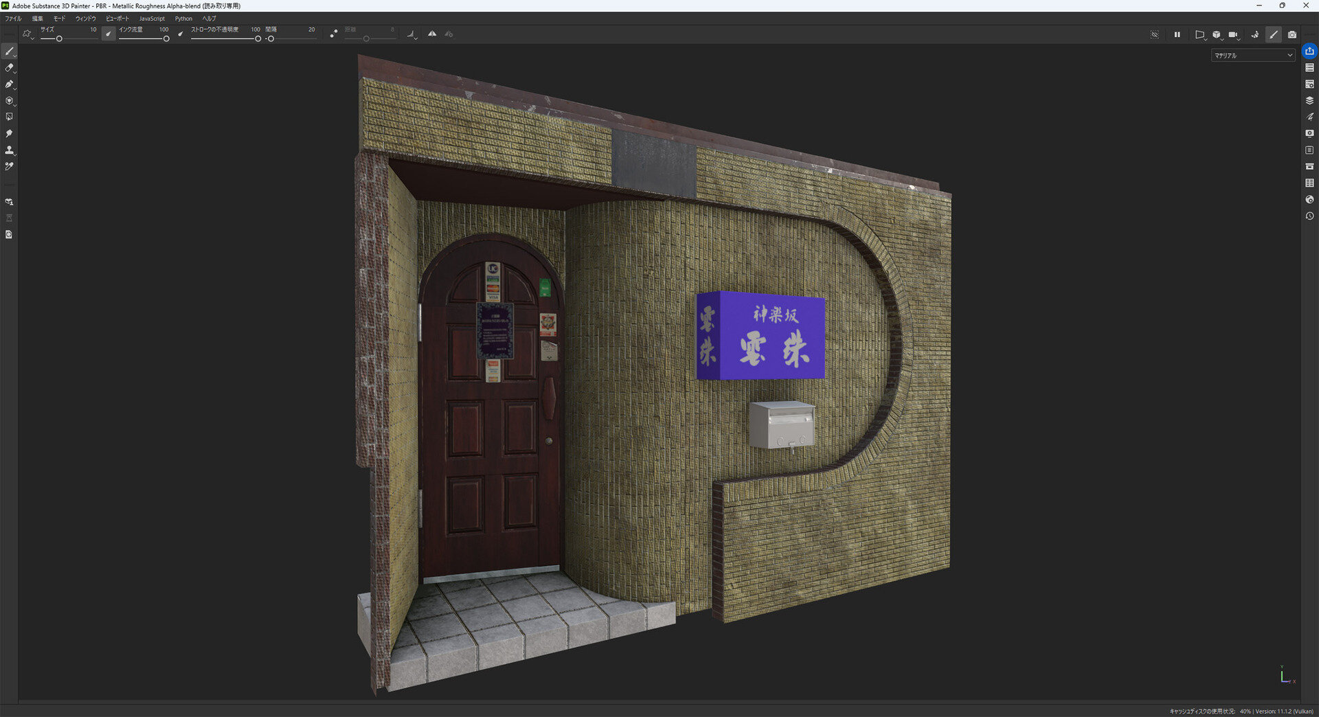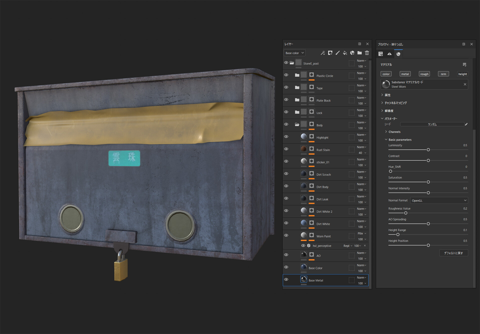 Substance 3D Painterを使いました。PBR(物理ベースレンダリング)の考え方に基づいてメタリック値・ラフネス値を素材ごとに詰めていきました。