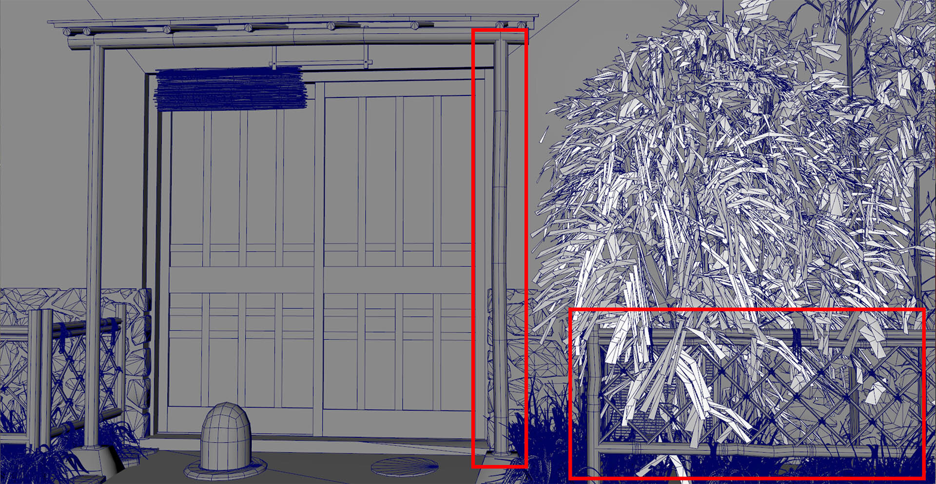 ▲ 完成したMayaのシーンファイル。屋根や柱、左右の柵など、直線になりやすい箇所(※図中の赤枠など)をあえて微妙に歪ませることで、CG特有の硬さを抑えた表現を目指したという