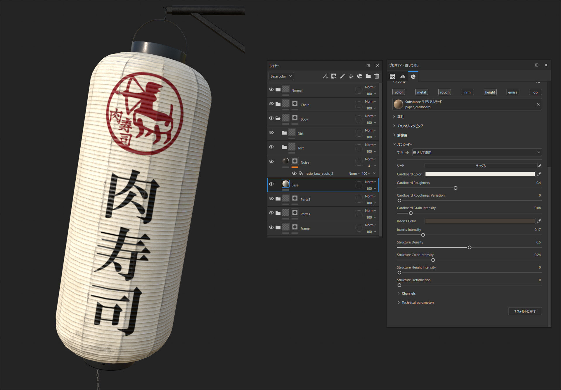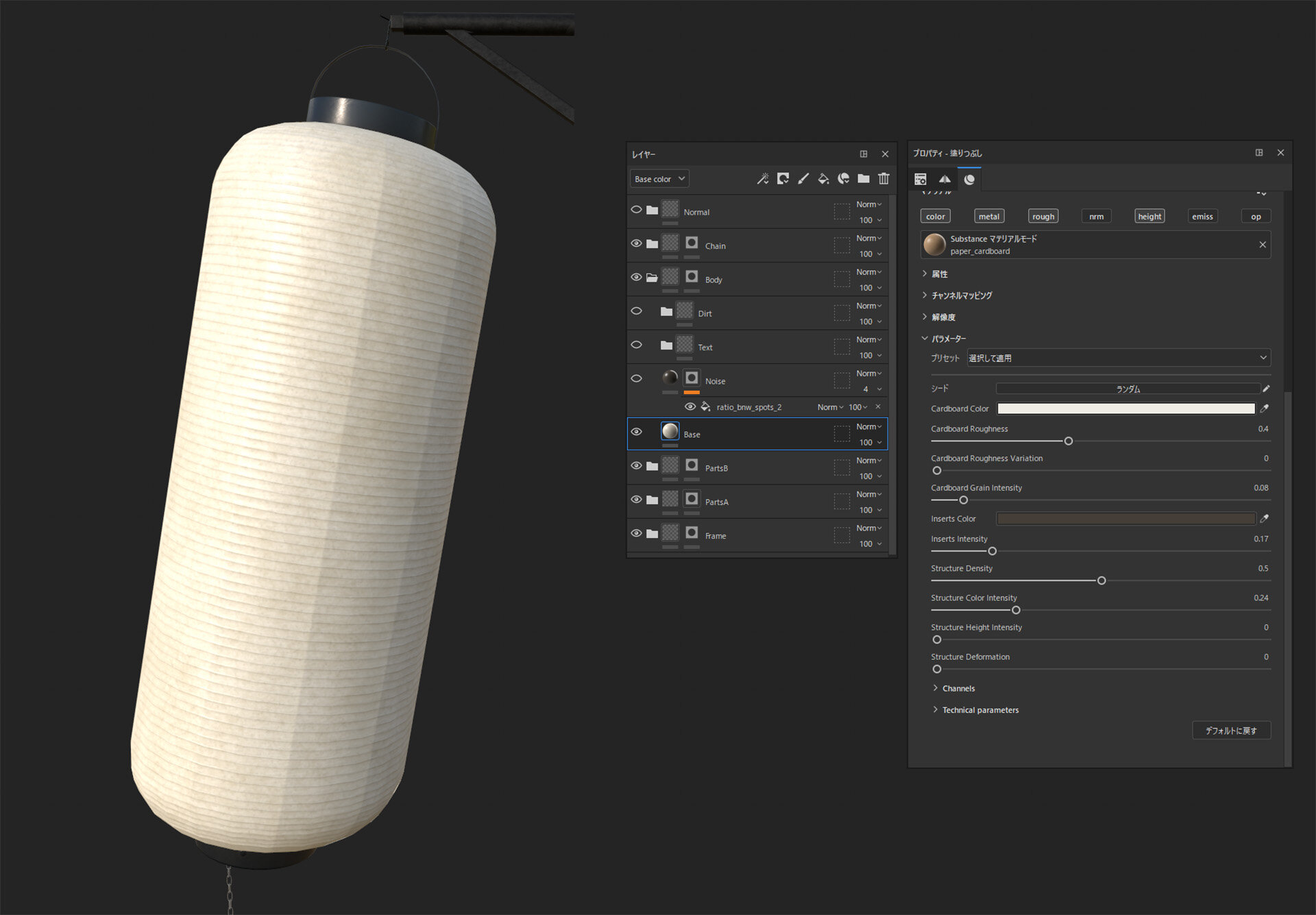 ▲ 完成形。提灯の火袋の紙の質感を表現するために、「Cardboard Paper」をベースに使用。その上から経年劣化による汚れやキズなどが追加された
