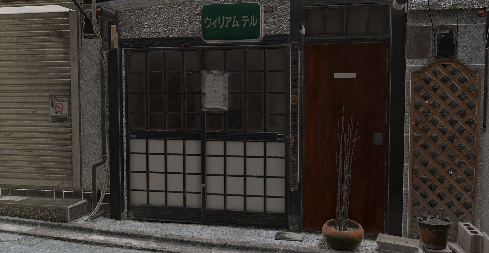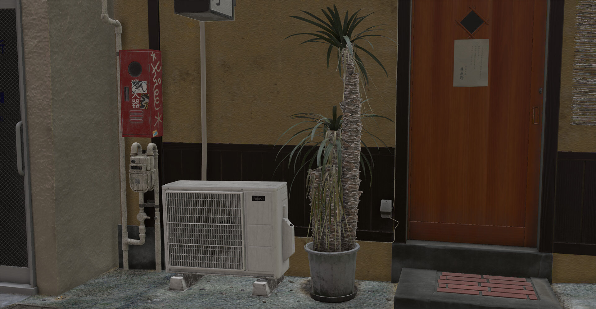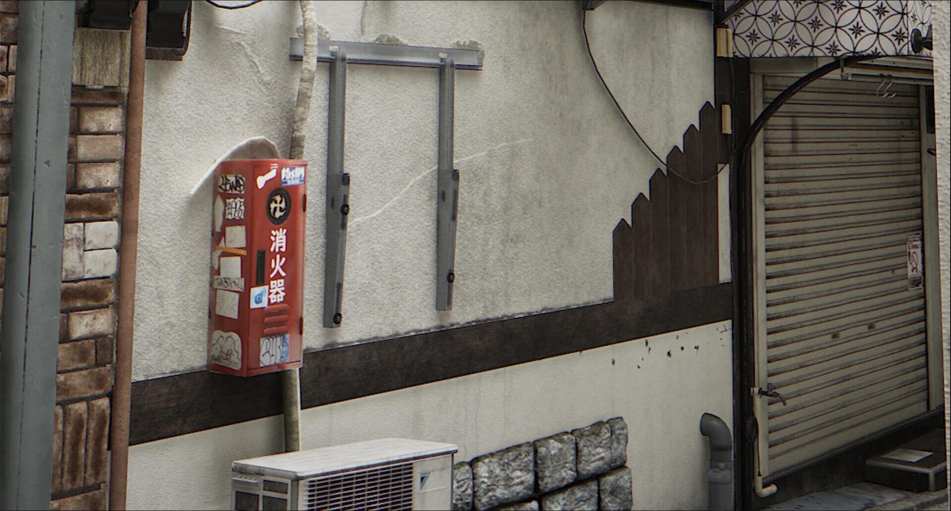 正面奧の建物や小道具類を担当しました。実は、正面奧の建物はリファレンスでは外壁が綺麗な状態だったのですが、そのまま再現すると周囲から浮いて見えてしまうため、周辺の建物の汚れを参考に、自然な経年感を加えました。