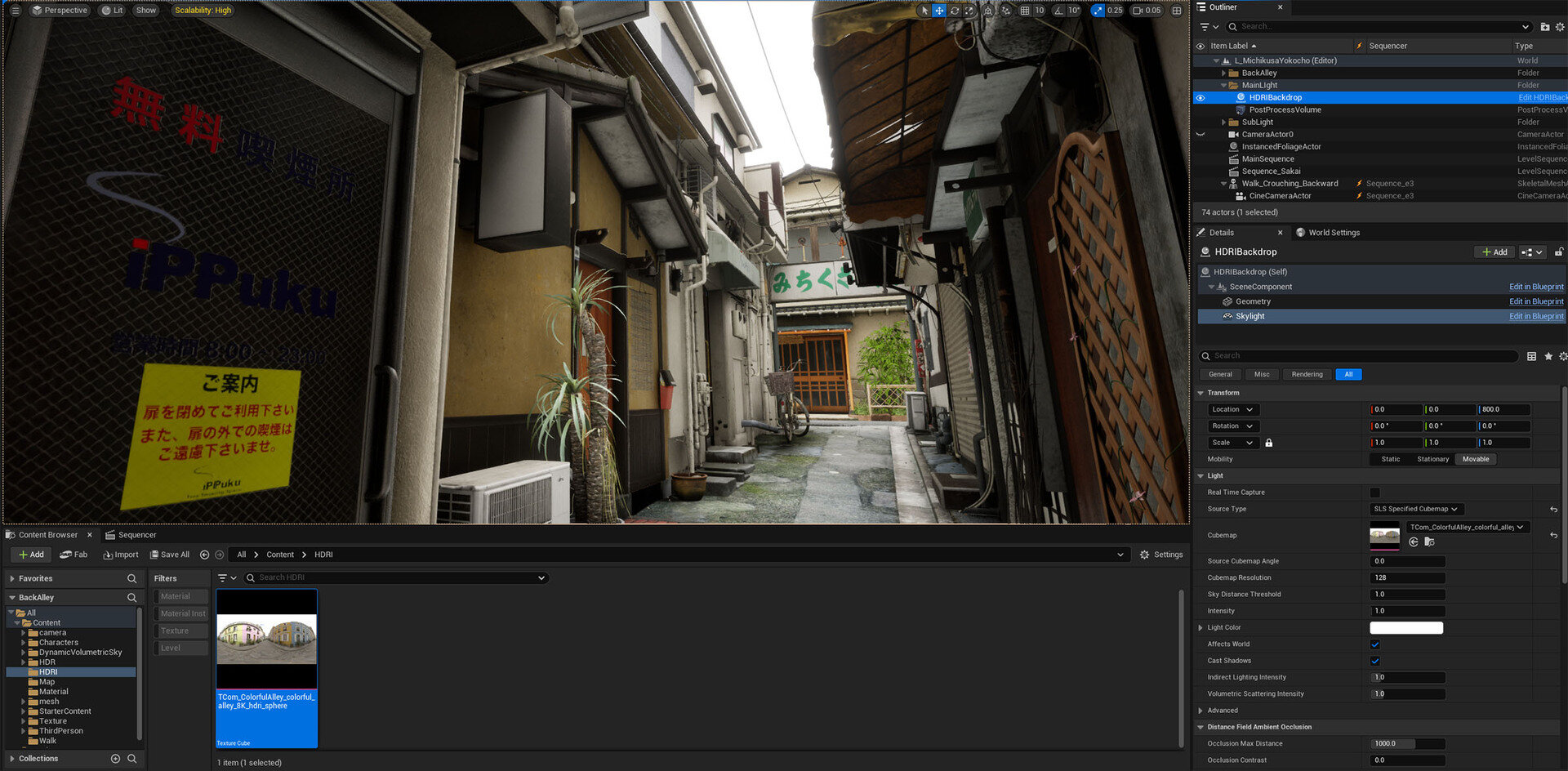 Directional LightやSky Lightで試行錯誤しましたが、影の落ち方が上手く調整できなかったため、最終的に市販のHDRIを採用しました。