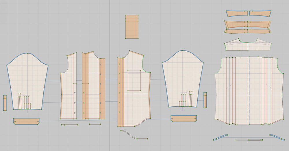 服を立体的につくるための設計図をパターンという。服は最初から立体として存在しているのではなく、平らな布を必要な形に切り分け、方向や角度を考えながら縫い合わせることで、初めて立体へと変化していく。布をどの向きに配置し、どの線同士をつなげるのかを決めること自体が、パターンの重要な役割である。