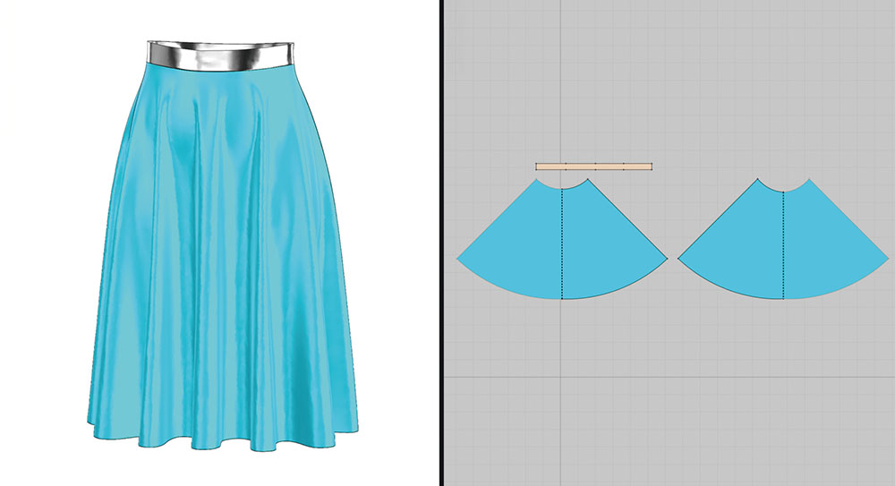 MDなどでシミュレーションをする際にも、この分量配分の考え方は重要で、フレアの開き具合は布のながれやシワの出方、揺れ方の印象を大きく左右する。分量がどの方向へながれるのかを意識すると、説得力のある動きを組み立てやすくなる。