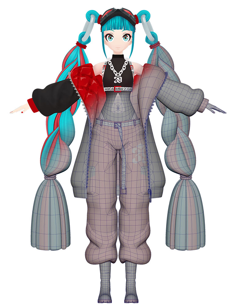 初音ミクのモデルはサブディビジョンサーフェスを適用するため、ポリゴン数は比較的少ない。制作時には、シルエットへの影響度やカメラに映る大きさ、揺れ具合などを基準に、モデル表現とテクスチャ表現を厳密に切り分けている。