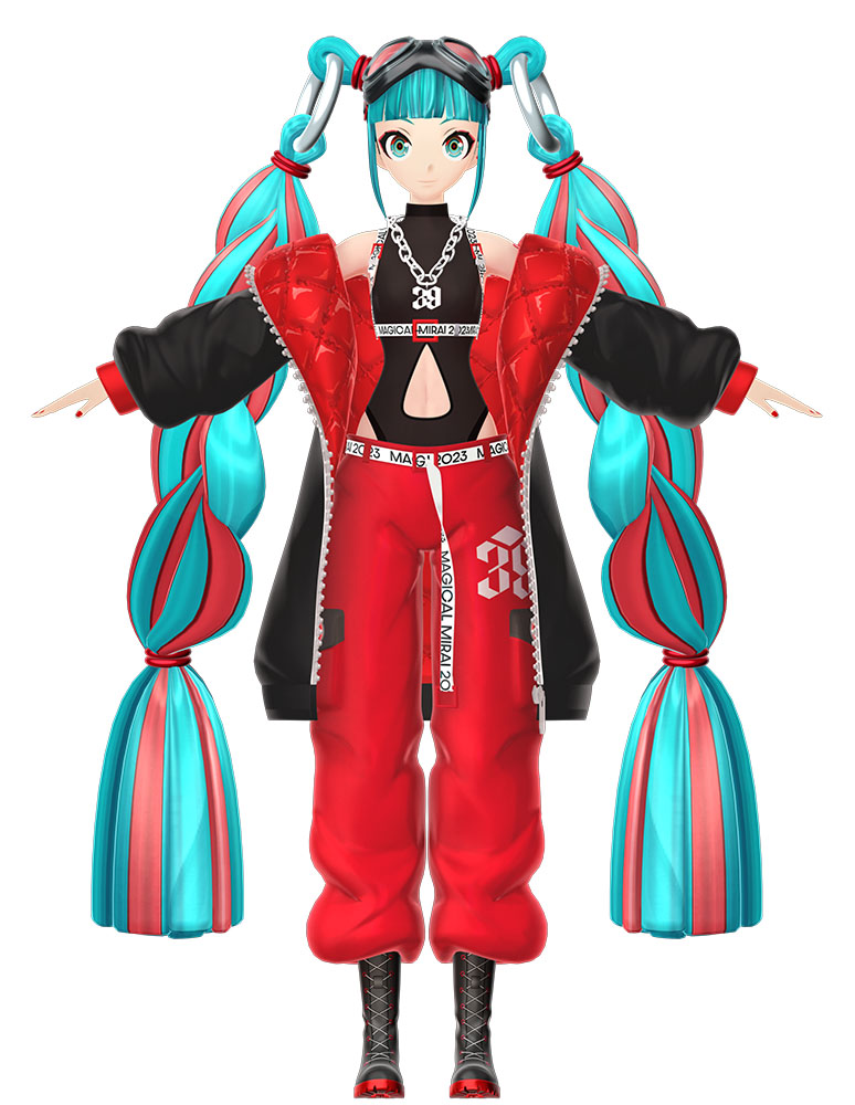 メガホンやスピーカーといった小道具も含め、動きの中でのカッコ良さを重視。パンツスタイルだからこそ床に座る演出が可能となり、巨大なツインテール(ウィッグ設定)も座り動作時には床に沿うよう調整された。ベルトには「MAGICAL MIRAI 2023」の文字が電光掲示板のようにながれる演出も仕込まれている。