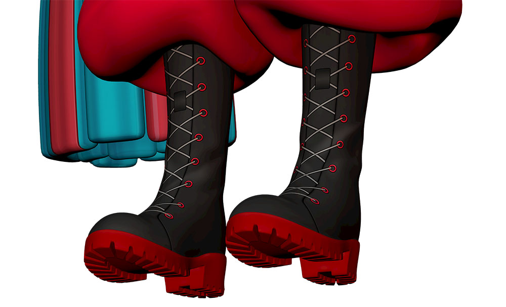 衣装制作の基本的なながれは共通だ。まずはクライアントから提供されるデザイン画を基に、社内ミーティングを行う。ここでは、衣装の中で特に破綻が起こりやすい要素、例えば、スカートや振袖のような大きな面積の揺れもの、長い紐やチェーン、腕を上げた際に相貫しやすい肩まわりのパーツなどを事前に洗い出す。馬杉氏が造形上の懸念点を提示し、田中氏がボーンやコリジョンの置き方を検討し、必要に応じて形状調整を提案する。