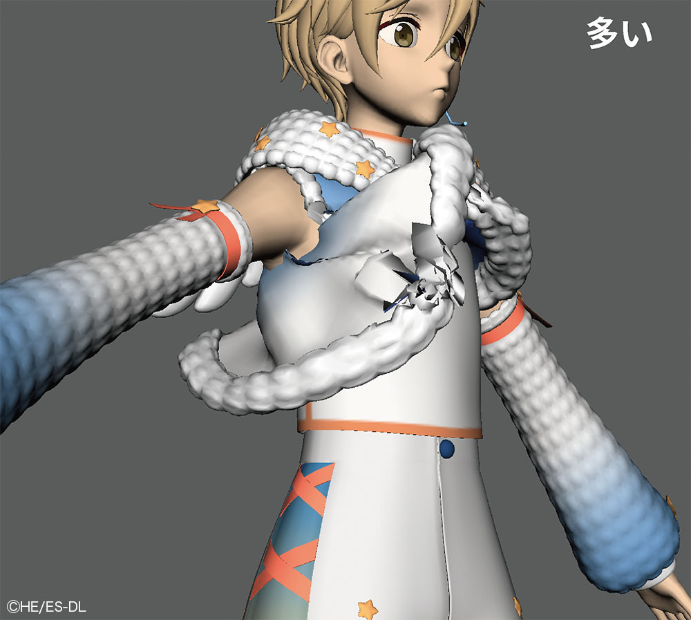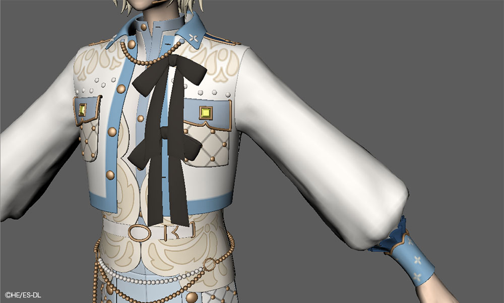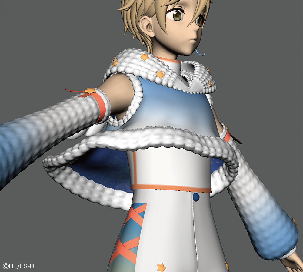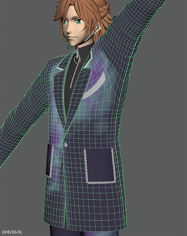 本衣装では、ジャケットの胸元や袖口に糸がほつれたような表現がデザインとして盛り込まれている。この"ほつれ"はシルエットに影響するためテクスチャでは対応せず、モデルで表現された。さらに、小さなジョイントを仕込み、nHairで揺れまで設定している。