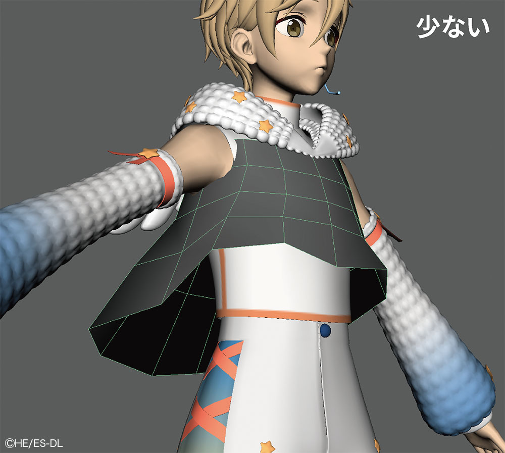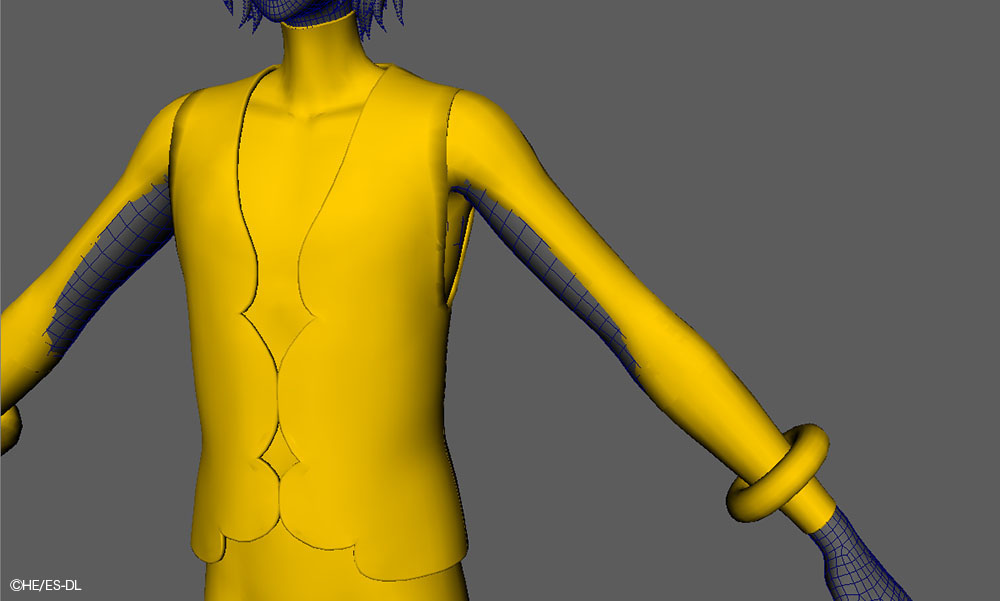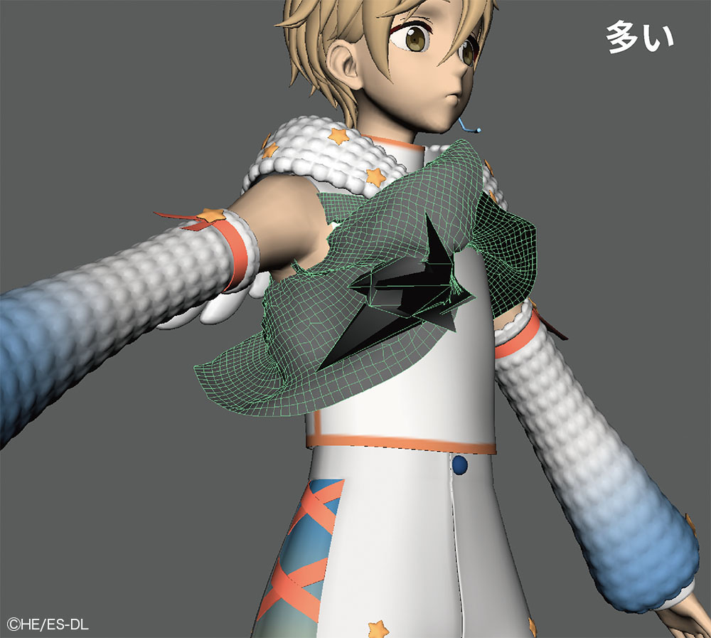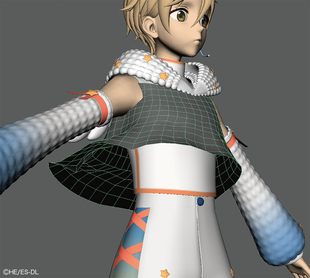 本衣装では、ジャケットの胸元や袖口に糸がほつれたような表現がデザインとして盛り込まれている。この"ほつれ"はシルエットに影響するためテクスチャでは対応せず、モデルで表現された。さらに、小さなジョイントを仕込み、nHairで揺れまで設定している。