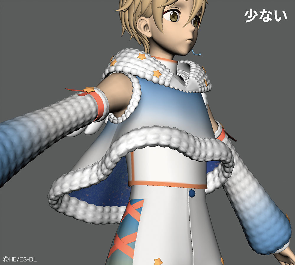 本衣装は、襟や裾、アームカバー、フットカバーにいたるまで"モコモコ"したシルエットがキャラクター性の要となるため、テクスチャ表現に頼らず、全てモデルで制作する方針が採用された。シルエットを最優先にした設計と、最適化されたシミュレーションによって、常に"可愛さ"を崩さない揺れ表現が成立している。
