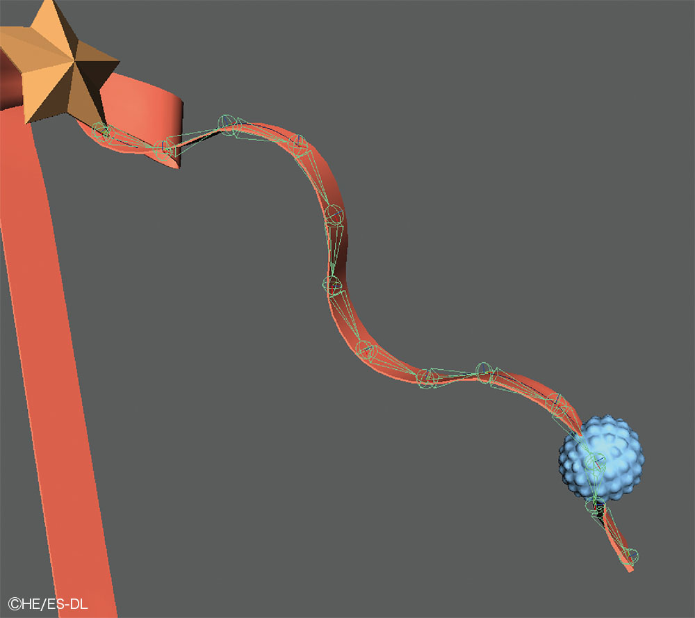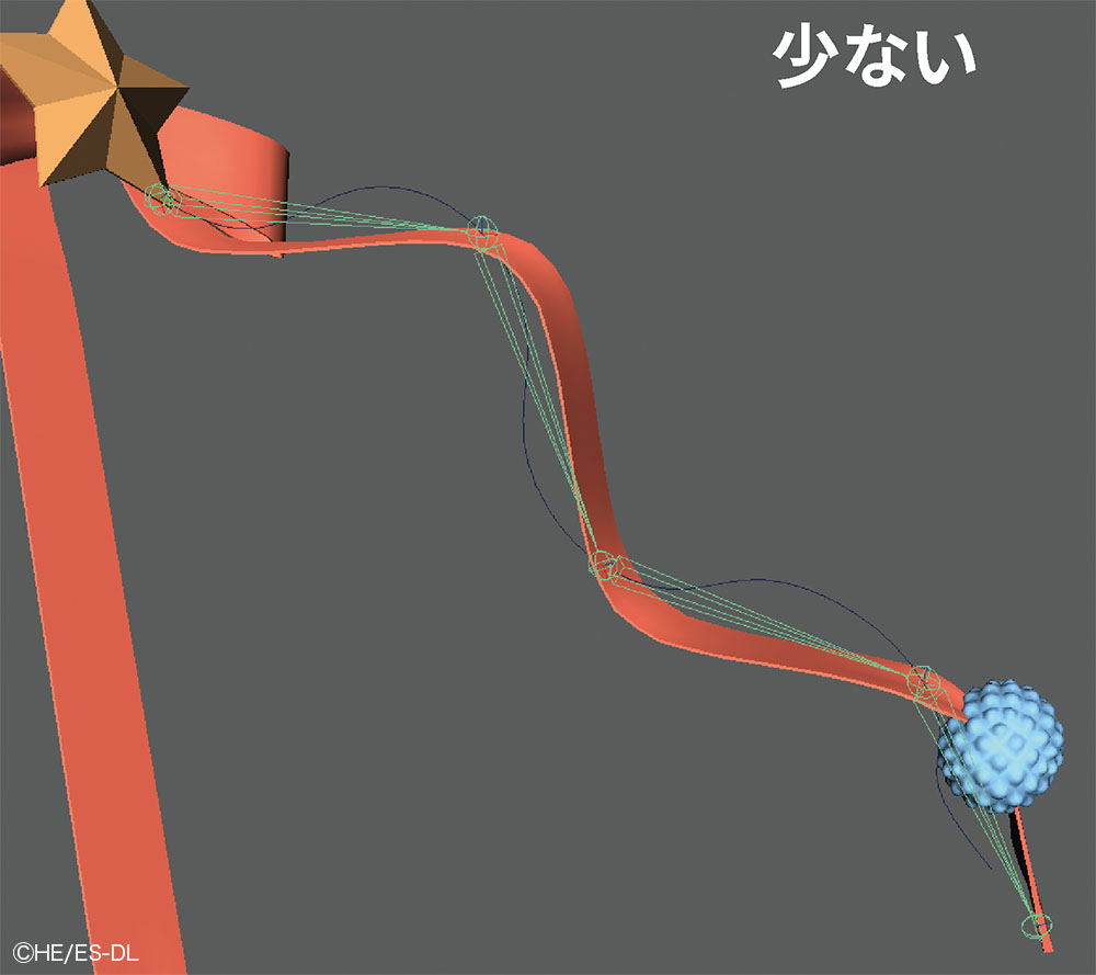 細長い揺れものはnHairによるシミュレーション結果をベイクしたカーブの上に、SplineIKのジョイントを配置した。ジョイント数が少ないとカーブ形状と一致せず、軽やかさが失われるため、シミュレーション結果を見ながら数を調整している。