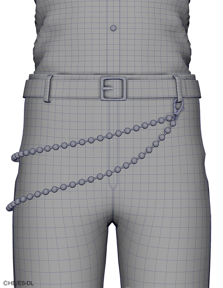 チェーン類は、まずパンツなどに沿ってカーブを制作し、そのカーブ上にチェーンのインスタンスを配置する手法を採用。監修段階では、ポリゴン化せずカーブのまま調整を行うことで、衣装全体のバランス変更や修正指示にも迅速に対応できるようにしている。