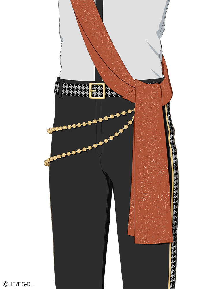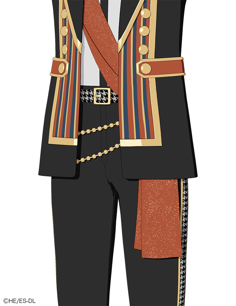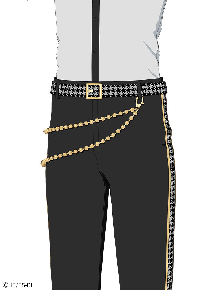 本衣装は、パンツの上にチェーン、その上にサッシュ、さらにジャケットが重なる多層構造を採用。Aポーズの状態では見えない部分であっても、ライブ中の動きや揺れによって露出する可能性があるため、ベルト通しとチェーンをつなぐ金具までリアルに造形された。