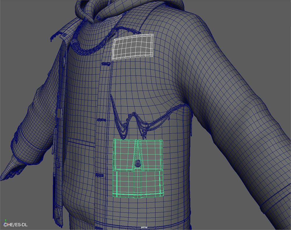厚みをもたせた部分は、表裏でポリゴンの割りを可能な限り一致させている。割りがずれると、折れ曲がった際に裏面が貫通しやすくなるためだ。ポケットやワッペンなどの付属物も下地となるジャケットと割りを揃え、めくれ時の追従性を確保した。