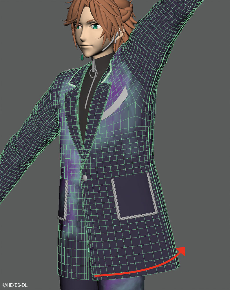 本衣装では、ジャケット全体をシミュレーションで揺らすのではなく、前腕や胸下など、動きによる見えの変化が大きい範囲にのみシミュレーションを適用している。胸元や脇まわりは、腕を動かす度にめり込みや破綻が発生しやすく、シミュレーションで揺らすとかえって修正負荷が増すためだ。
