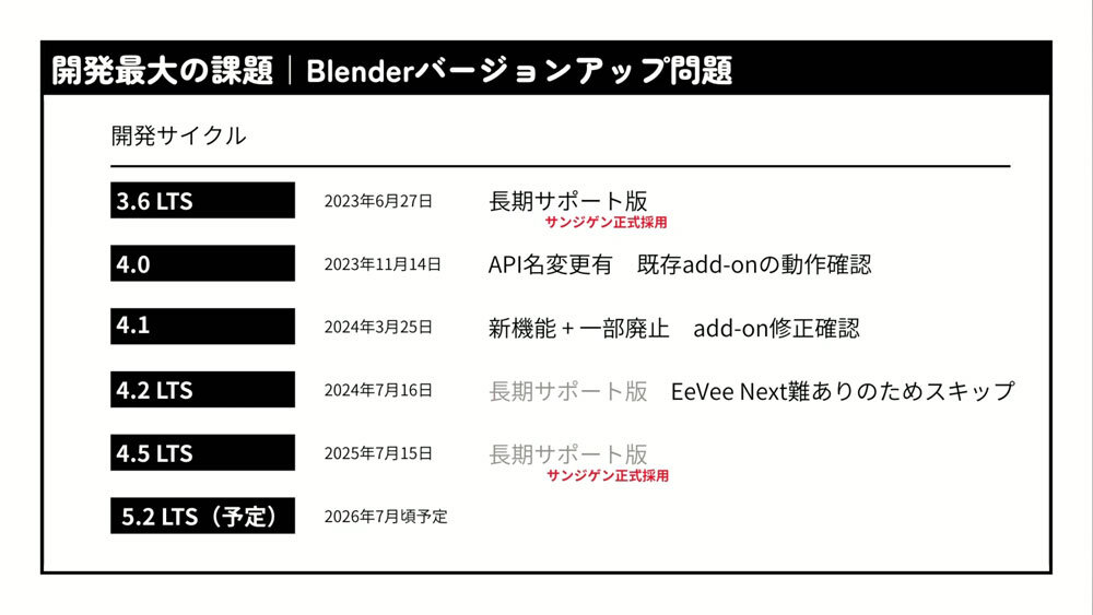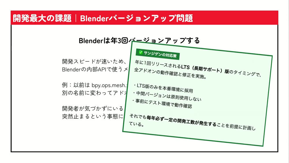 これに対するサンジゲンの対応策は明快だ。年1回リリースされるLTS(Long Term Support/長期サポート)版のタイミングで全アドオンを検証し、新バージョンを試すのは一部スタッフに限定する。さらに、本番環境はLTS版のみ採用し、中間バージョンは原則使用しないという運用をしている。