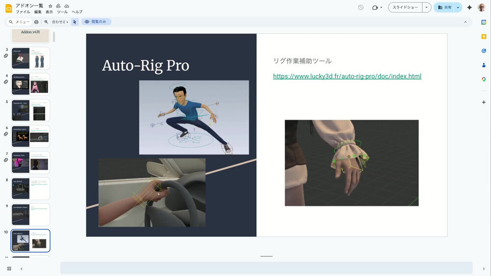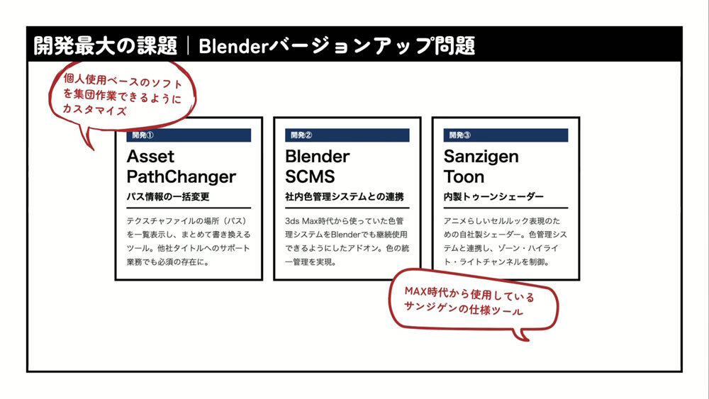 Blender導入時にサンジゲンが先行開発した3つのツールも紹介された。「Asset PathChanger」は、3ds Maxの「アセットトラッキング」に相当するツールだ。Blenderには大規模チーム向けのアセット管理機能が充分に備わっていないため、チーム制作ではこうした仕組みが欠かせない。森田氏は「チームで仕事をするなら必須で、今はどの会社も自前でつくっているはずです」と語る。