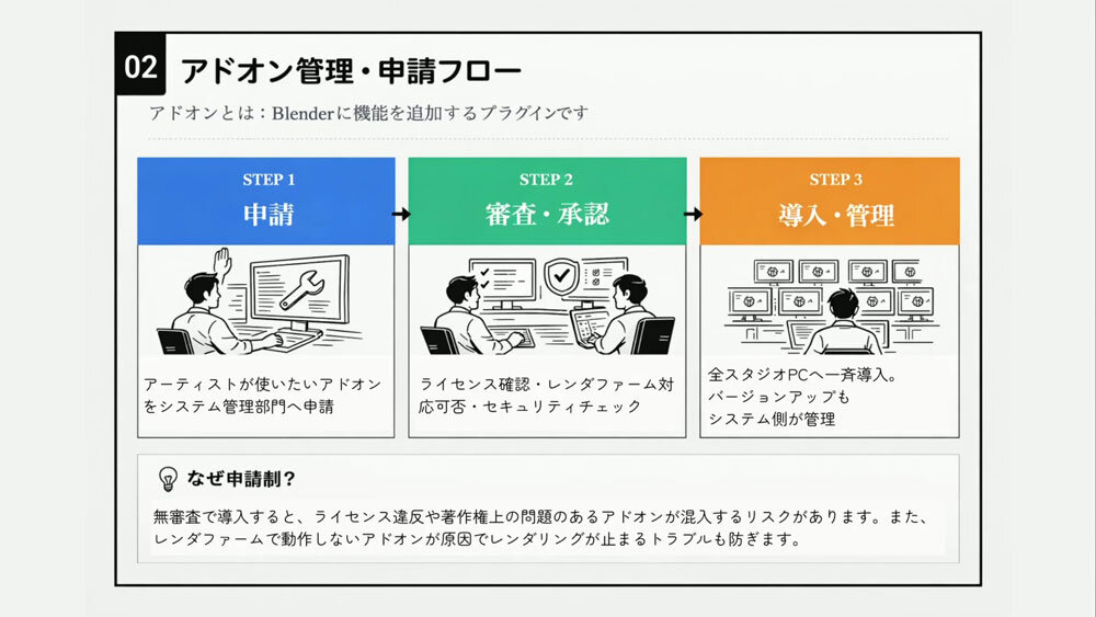 アドオンの導入についても、そのフローを明確に定めている。始めにアーティストが使用したいアドオンをシステム担当に申請。ライセンスやセキュリティ面の確認を経て、承認されたアドオンのみをスタジオのPCに一斉導入する。