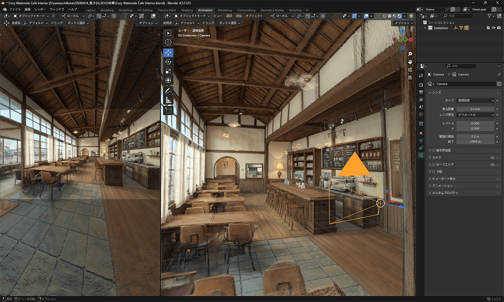 Blenderは、コスト以外に技術的な利点も大きい。例えばBlenderのレンダリングエンジンであるEeveeは非常に軽快で、3Dビューポート上で確認しながらリアルタイムに作業を進められる。
