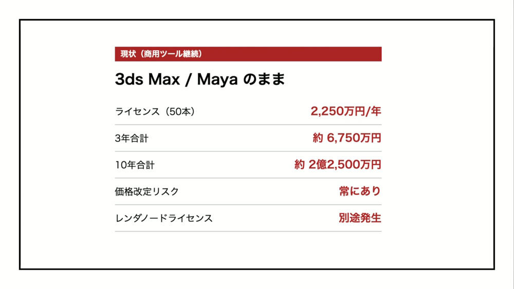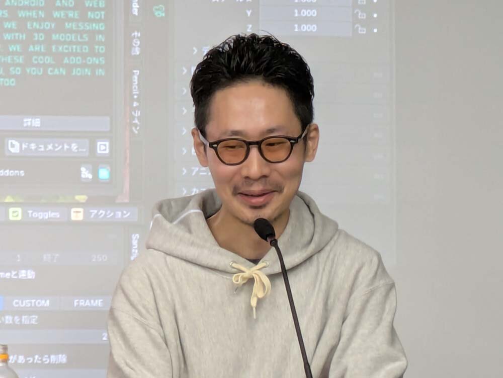 まず語られたのは、「Blenderの魅力」だ。同社にとってBlender最大の恩恵は、ライセンス費用が発生しない点だという。サンジゲンには約200人のスタッフが在籍しており、そのうち7割が3DCGソフトを使用する。3年ごとに発生する巨額の更新費用を、別の投資に回せるようになったことは、大きなメリットだった。