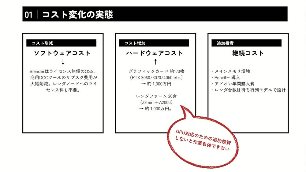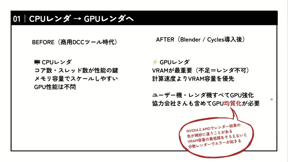 また、GPUはNVIDIA製とAMD製で描画結果にわずかな差が生じ、色味が異なって見えることもある。分散レンダリング時には、そうした差異が映像のちらつきにつながるため、サンジゲンではGPUをNVIDIAで統一している。