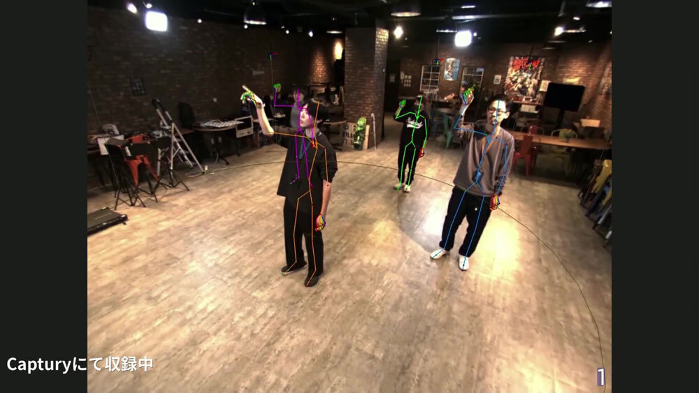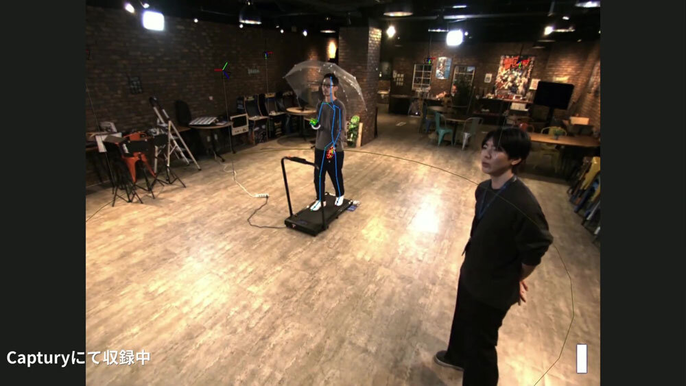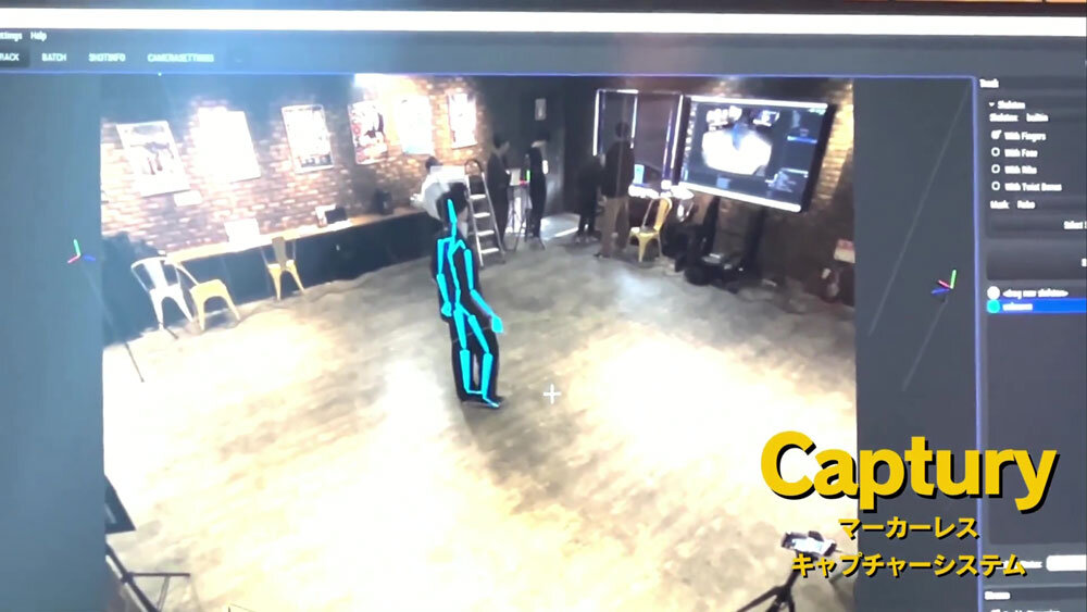 続いて、マーカーレスキャプチャーシステム「Captury」の解説がされた。スタジオ内のカフェスペースにカメラを吊り下げることで、キャプチャスタジオとして運用。12台のカメラで被写体を全方位から撮影し、モーションを取得している。