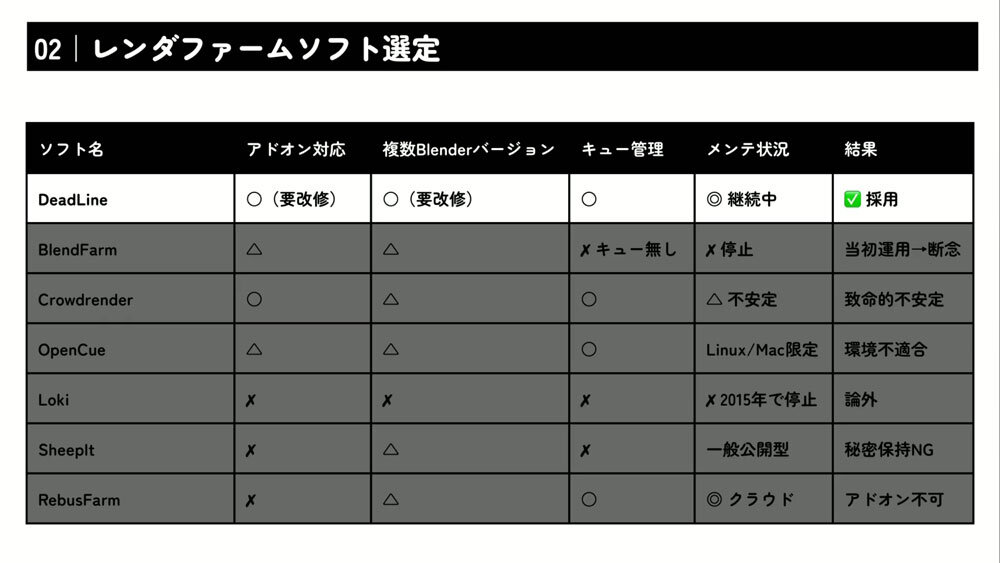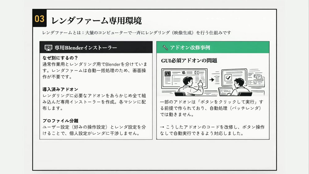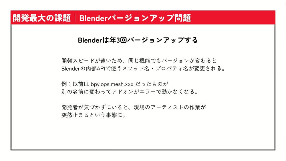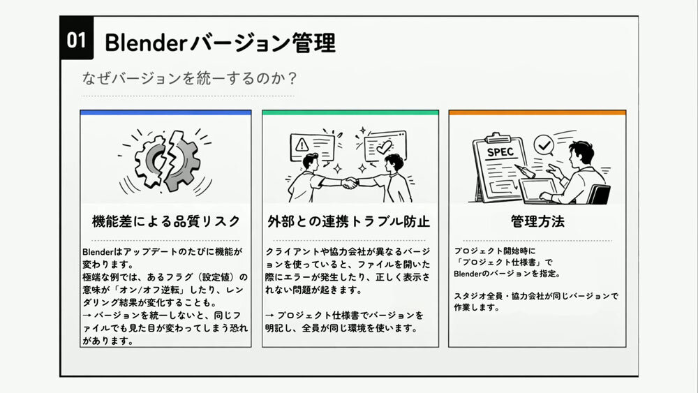 セッションの中盤では、Blenderのバージョン管理の話に多くの時間が割かれた。Blenderは更新頻度の高さが魅力である一方、内部プロパティの変更によってアドオンが動作しなくなることもある。そのため「作業中はバージョンを上げない」ことを徹底した。アップデートはシステム側で一括管理し、各マシンで異なるバージョンが混在するといった運用上の混乱を防いでいる。