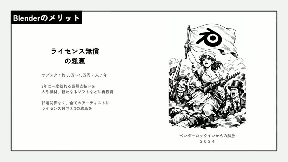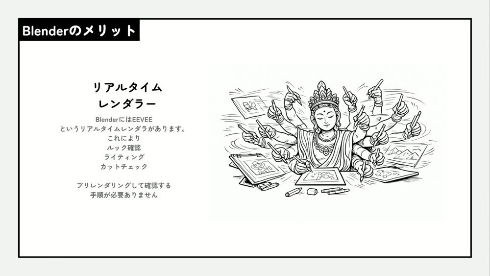 ただし、サンジゲンがBlenderへ切り替えた理由は「単にライセンス料の問題だけではない」と瓶子氏は強調する。その背景にあるのは、特定のソフトウェアに依存しないという姿勢だ。