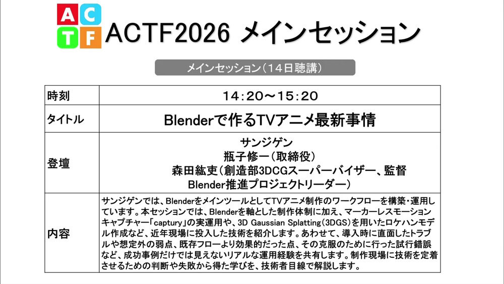 14日には各社事例紹介、15日にはセミナーと展示が行われ、アニメ制作関係者ほか多くの人々が聴講に訪れた。本稿では各社の事例紹介から、サンジゲンによる「Blenderで作るTVアニメ最新事情」の模様をレポートする。