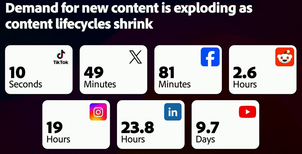 こうした広告コンテンツの需要増加は、各種SNSにおけるコンテンツが短命になっていることと関係している。例えばTikTokコンテンツは、全エンゲージメントの半数は10秒以内に生じ、残り半分はさらに数分かけて起こっている。このようにコンテンツが短命になっているため、顧客とのエンゲージメントを維持するためには次々とコンテンツを投入する必要があるのだ。
