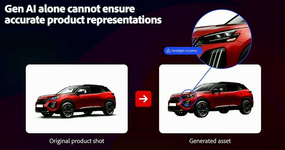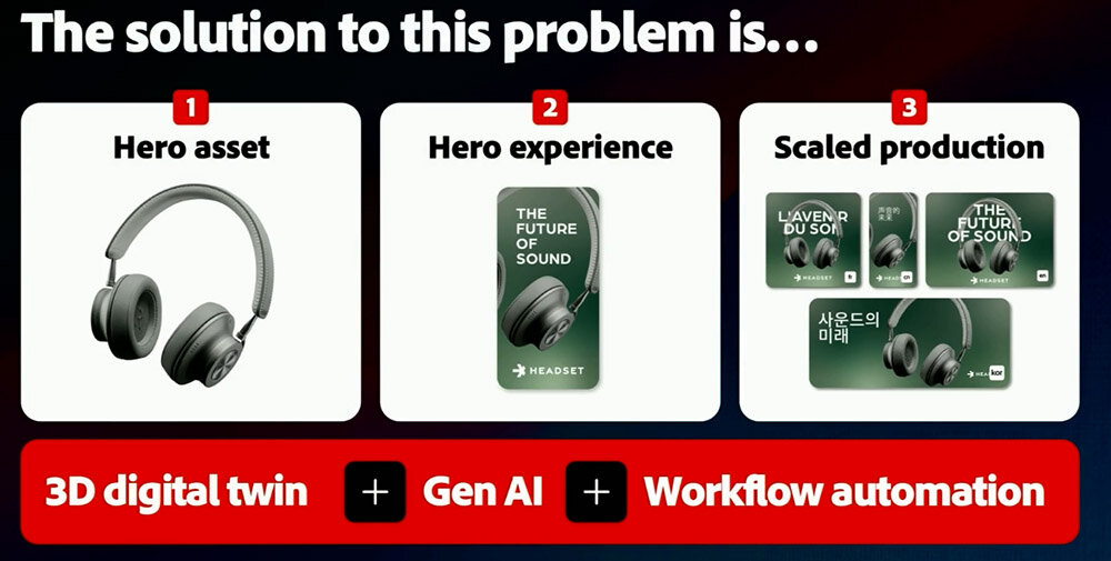 以上のような課題を克服するためにAdobeが提案するのが、3Dデジタルツインと生成AIを併用した広告コンテンツ制作だ。この提案は、広告の中心となる商品は3Dデジタルツインとして制作し、背景などは生成AIによって生成する、というアプローチである。