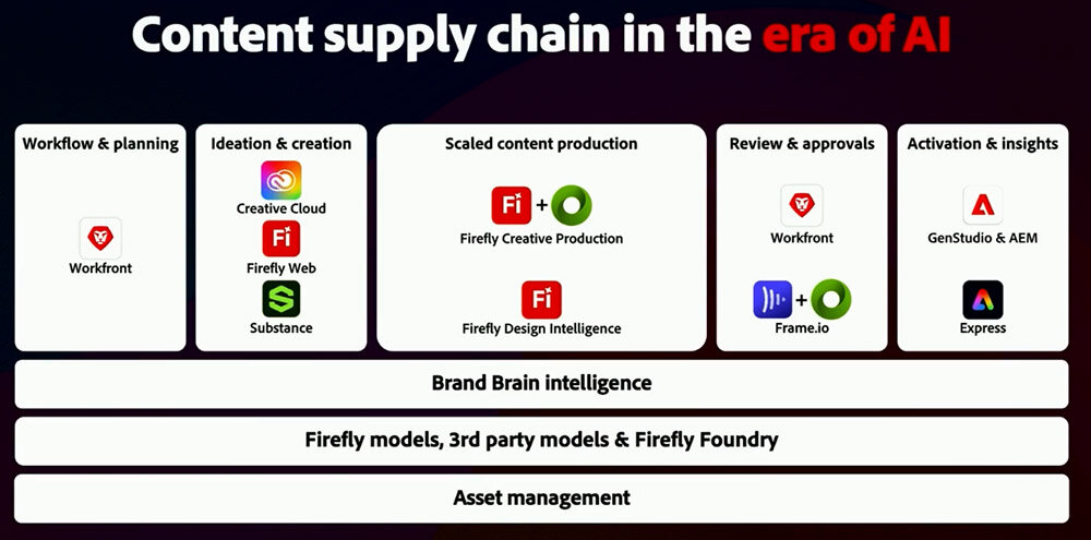 以上に紹介した3Dデジタルツインと生成AIを併用する広告コンテンツ制作に関して、Adobeはワークフロー全体にわたって各種Adobe製品を提供している、と述べてパーマー氏は発表を終えた。