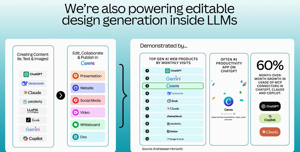 また、Web上から利用するAIサービスとしては、CanvaはChatGPTとGeminiに次ぐ3番目に位置づけられる。このように、Canvaは現代における代表的なAIアプリのひとつなのだ。