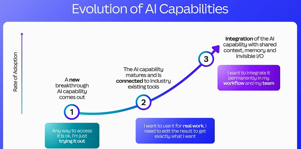 続いてコラッツァ氏は、AI機能実装の3段階について話した。一般にAI機能は以下のような3段階を経て、その業務活用が浸透していく。