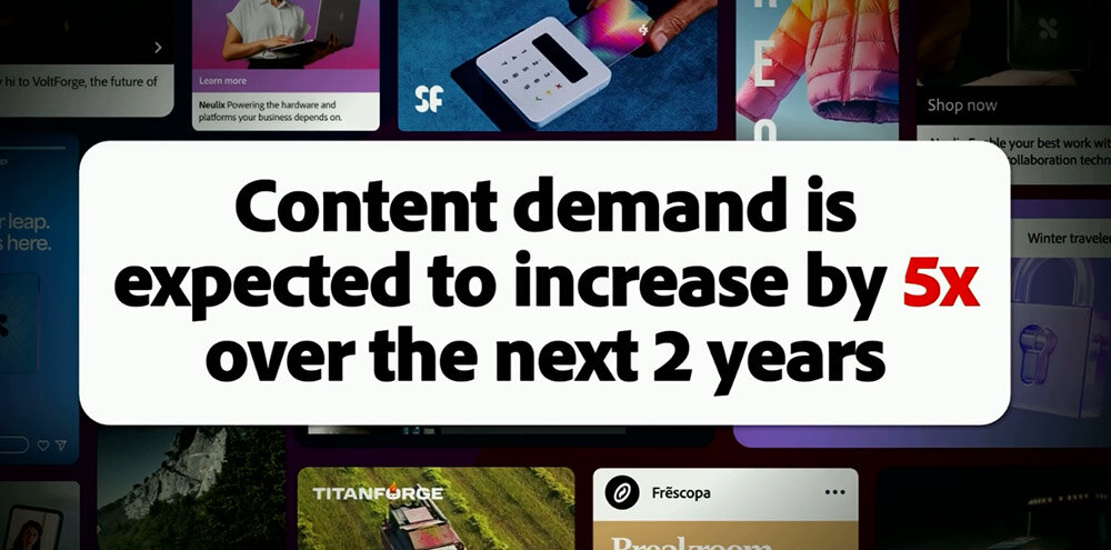 はじめにパーマー氏は、近年の広告コンテンツの需要の高まりに言及した。Adobeが行なった調査によると、広告コンテンツは今後2年間でその需要は5倍になる、と予想されている。