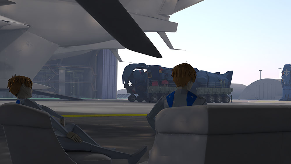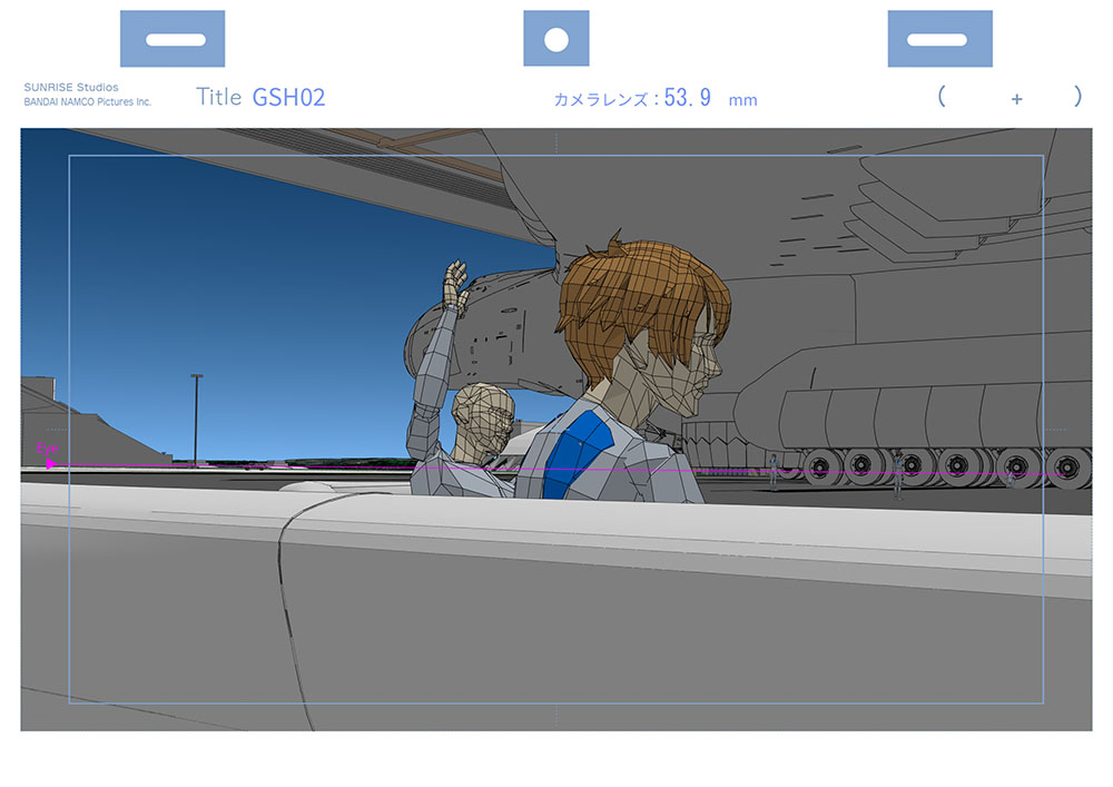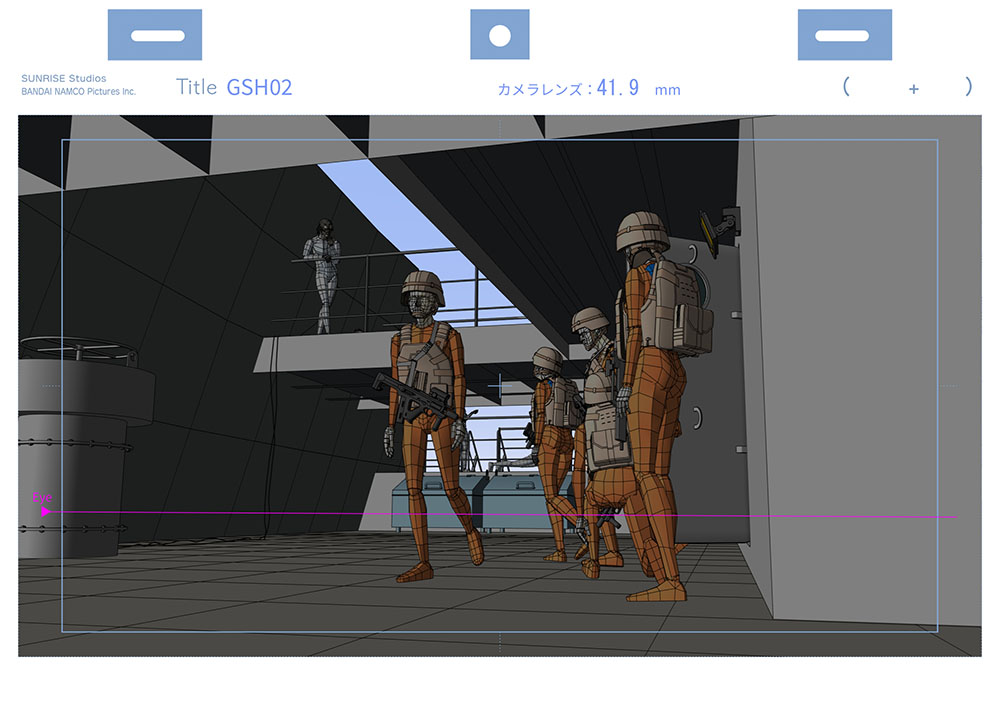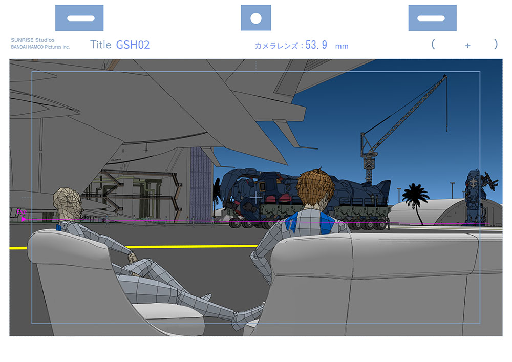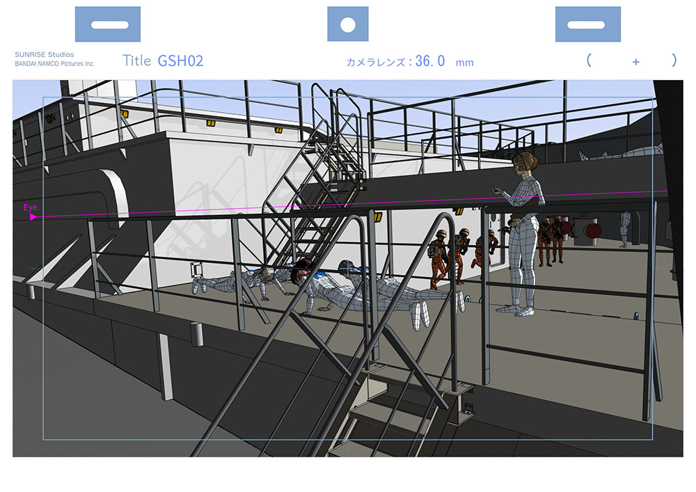 濱中:そうです。背景やメカに加えて、主要キャラクターのVコンテ用モデルも用意していました。髪型まで造形したローポリゴンで、キャラクターごとにプロポーションが異なり、股関節の位置も個別に設定している。体型の当たりがそのまま取れる状態です。これにポーズや動きを付けた上で、カメラワークを決めていました。