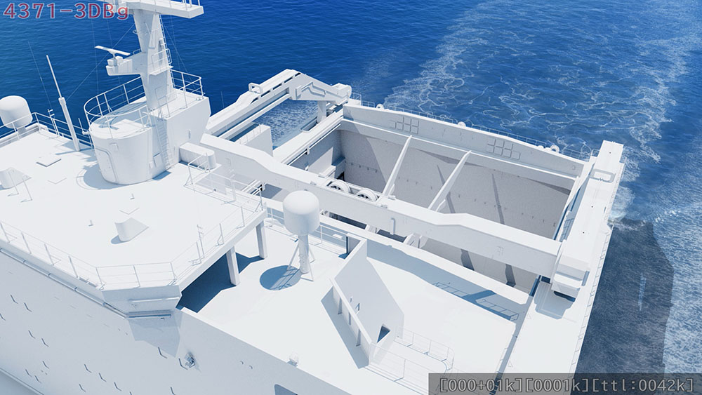 そこで、流用できる素材はできるだけ流用する方針にしました。カメラ高、進行方向、速度、光源方向のちがいごとに条件を整理して、汎用的に使える海面素材をつくっていく。大事なのは単に使い回すことじゃなくて、流用しているとバレないギリギリを探ることなんです。だから、「これとこれは共用できるはずだ」という判断を私の方でして、共用可能な素材のリストをつくっていました。遠景の白波からヴァリアント周辺の船首波や航跡波まで、基本的には同じ発想でやっていました。
