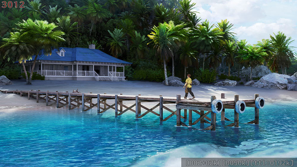 濱中:単に構図を決めるだけでなく、そのライティングや動きが成立するかを先に確認する工程になっていました。この日時の太陽の位置はどこか、キャラクターは何歩でドアに到達するのか、ドアの開閉時に干渉しないか、といったところまで3D上で詰めています。