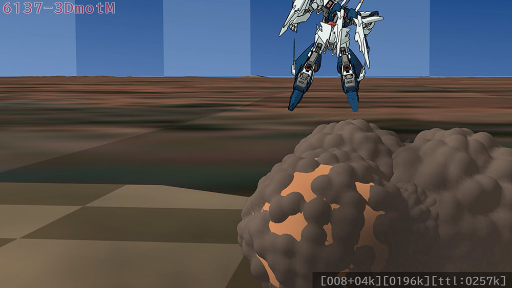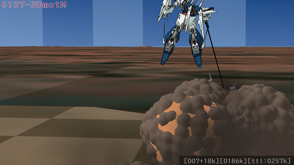 濱中:やはりSector 6のエアーズ・ロック(ウルル)戦中盤、Ξガンダムがアリュゼウスを追い詰めていくあたりですね。中でも、アリュゼウスを地面に叩き付けてから、ビーム・ライフルを何発も撃ち込むカットは印象に残っています。MS同士が取っ組み合っている、かなり珍しい場面でもありましたし、最後の最後まで苦労しながら皆で頑張ってつくった箇所でもありました。
