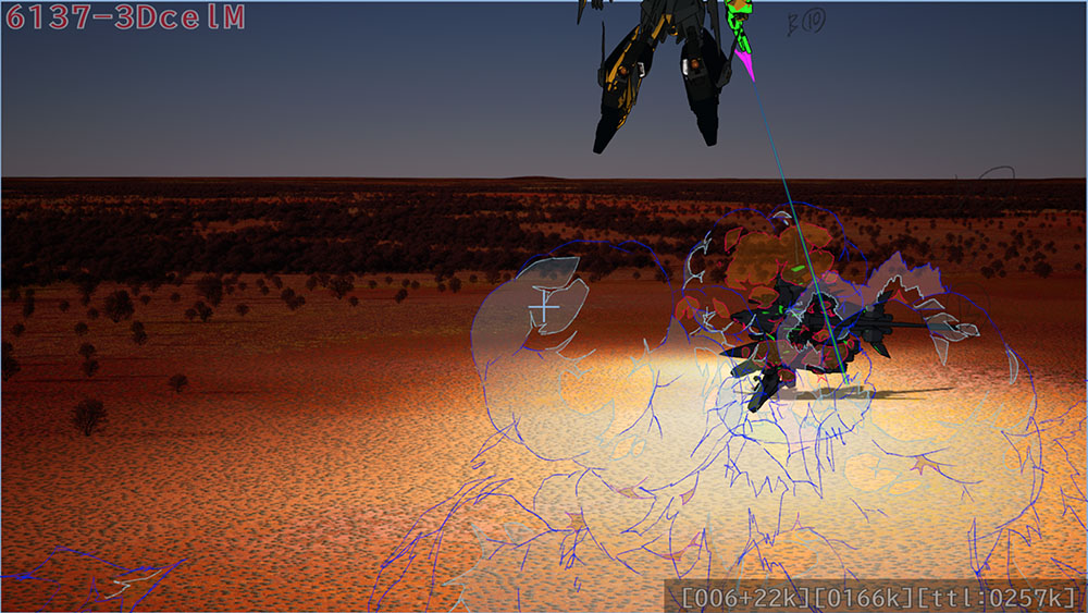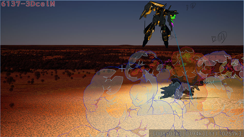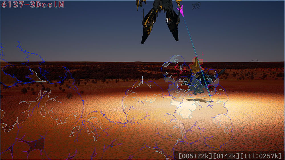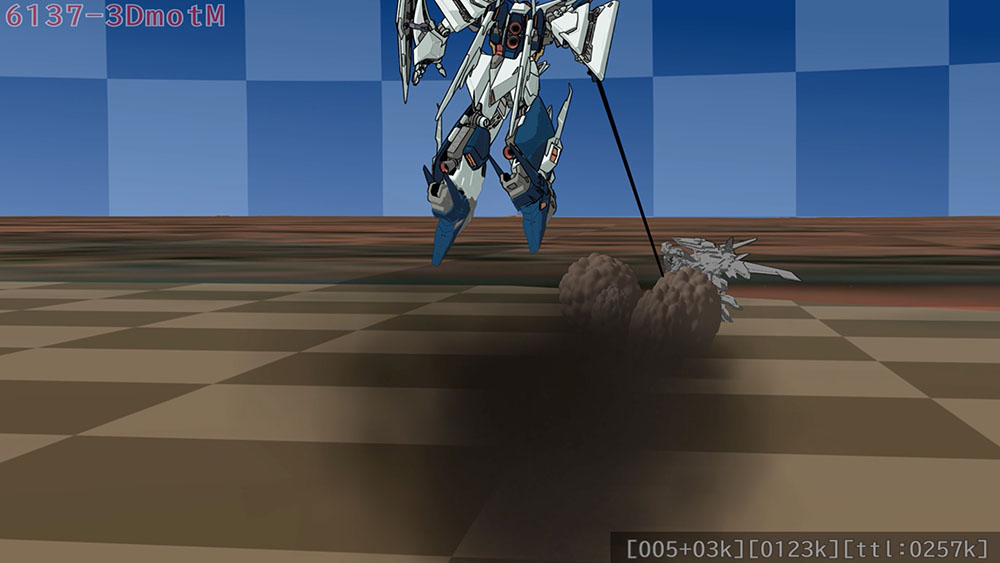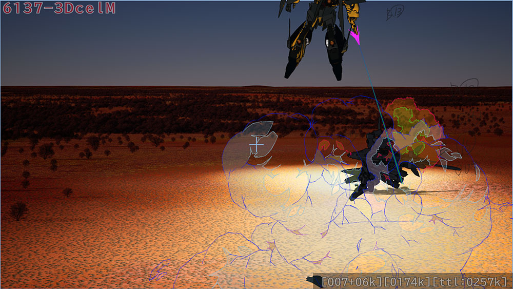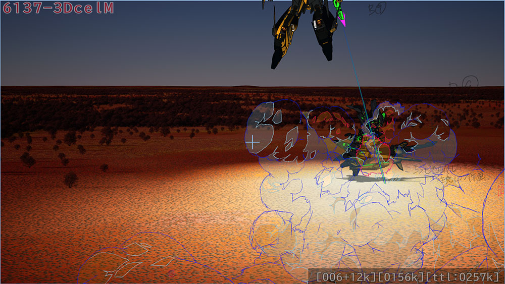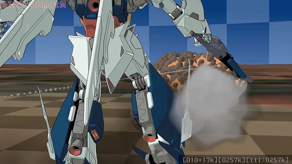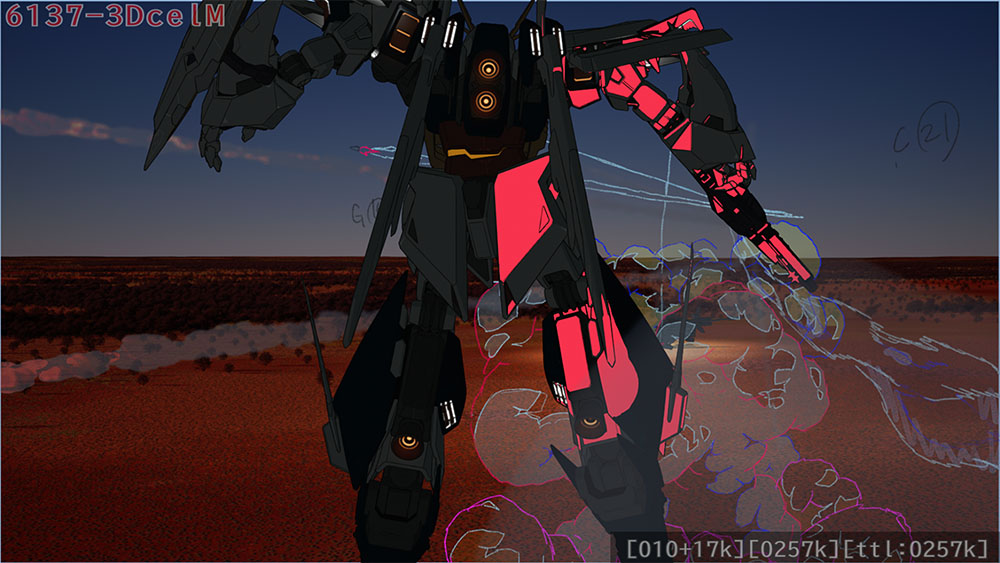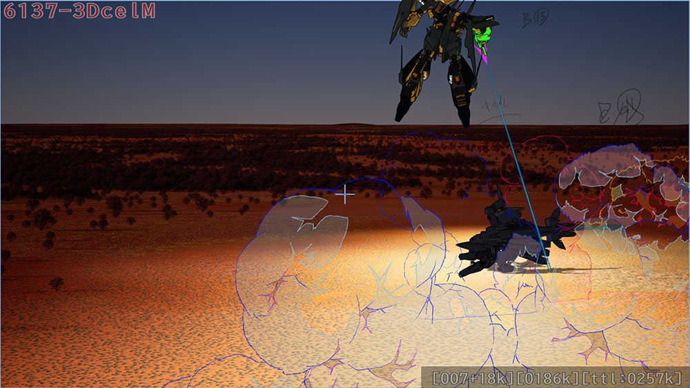 ▲アニメーションの完成テイク(撮影入れ前)。村瀬監督・CG演出・メカ作監などのチェックを経て、ビーム・ライフルの発射回数が11回に増え、全体の攻撃性と密度が引き上げられている