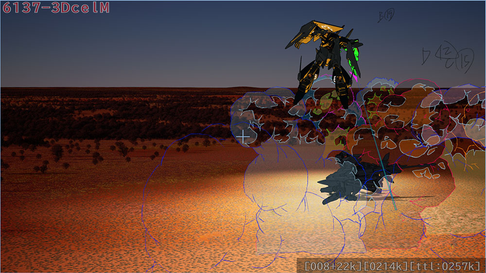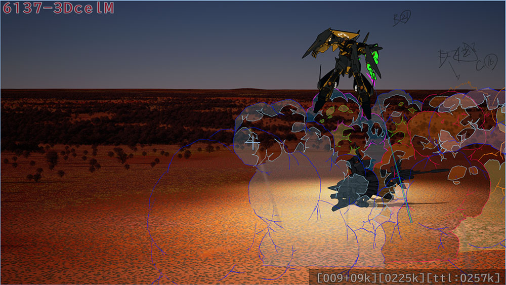 濱中:そうなんです。シンプルなセル調だとどうしても明るい面と影の面がゼロイチで分かれてしまう。でも村瀬監督が求めていたのは「この辺には0.5の明るさがあるはずだ」というような、中間的な陰影でした。とはいえ全部をGIのグラデーションで処理すればよいわけでもない。最終的にはセル寄りの表現を求めているんですが、従来のセル調のロボット表現にそのまま寄せれば済む話ではないと感じています。もし第3章に関わらせていただけるのであれば、そのあたりは大きな課題になると思います。