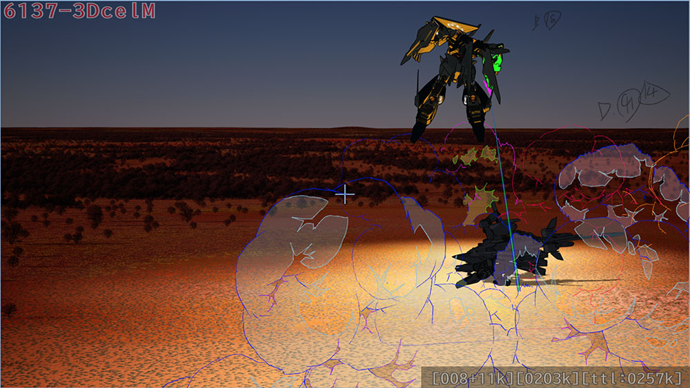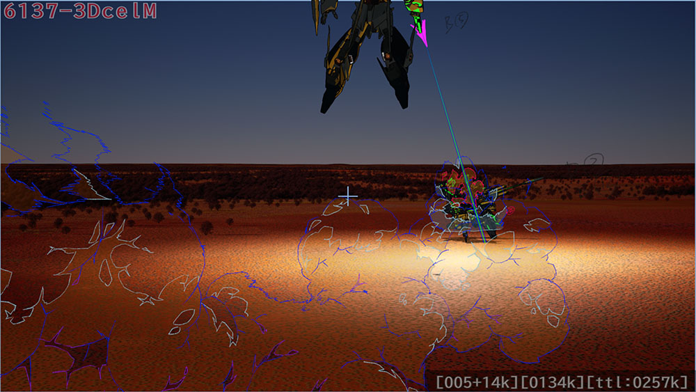 濱中:特にアリュゼウスのような線の多い機体は、真面目に光を当てると全部の線が出てきてしまって、かえって気持ち悪くなるし黒つぶれもしやすい。ディテールの多いデザインなのですぐ破綻するんです。その中で、ディテールは引き算しつつ、必要な情報は残っていて、なおかつカッコ良く見える状態を3Dライティングでどう再現するか。そこは今後の大きな課題だと思っています。