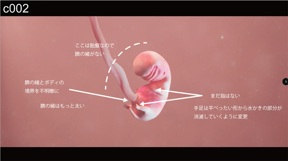 永田:まずは弊社で論文を読み込み、リサーチをしてから、詳細に資料をお送りして、絵コンテのやり取りもしつつ監修させて頂きましたね。例えば、映像の最初の赤ちゃんが胎内で成長する部分ひとつとっても「手の大きくなり方が発生学的におかしい」とか、「へその緒が細くなりすぎ」とか普通のCG制作では言われないような修正指示をたくさん受けていただいたと思います。