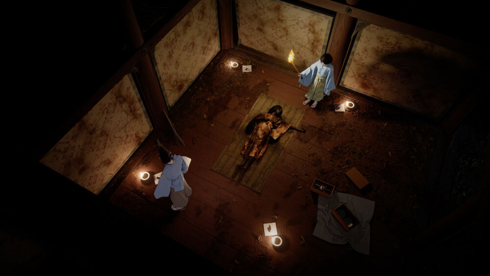 栗栖:現在の京都リサーチパークはかつて京都競馬場で、平安時代の大規模な邸宅跡が出土したことがあり、その報告書を邸宅の図面の参考にしました。もちろん寝殿造は現存していないので、別の資料も調べながら建物を3DCGでつくりました。さらに国土地理院の数値地図から京都の地形を取得し、邸宅跡から見た山の眺めをパノラマでレンダリングして背景美術を作成しています。東西南北の位置関係も正確に合わせています。