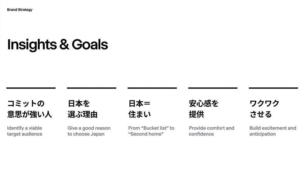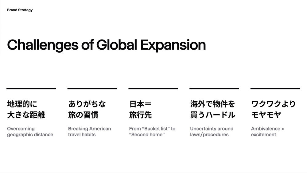 まずチームが直面したのは、英語圏のユーザーに向けてブランドをポジショニングし直すという課題だった。「海外から日本に来るだけでなく、日本で家を買うということ自体に、物理的な距離や言語、文化的な習慣のちがいなど、様々なハードルが存在します。日本は“旅行先”であって“住む場所”ではない、という認識を変えていく必要がありました」(二日一氏)。