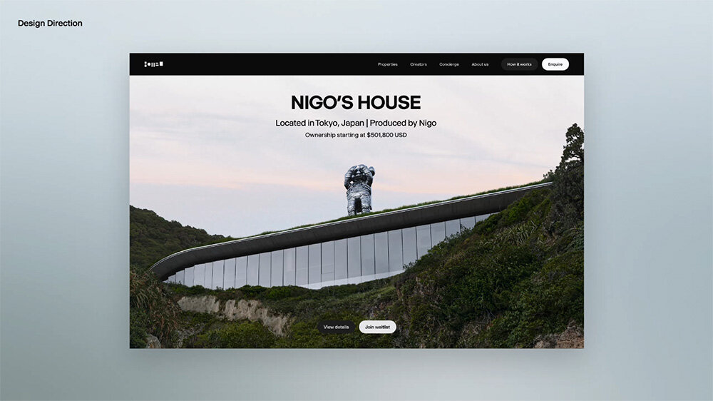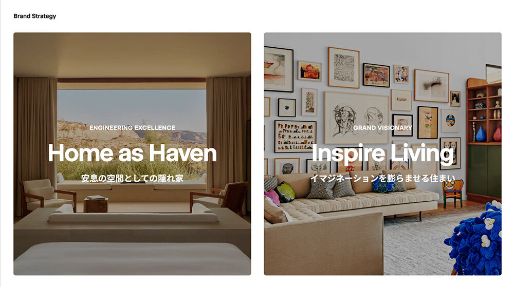 さらに、この2つの方向性を「ホーム・アズ・ヘブン」(隠れ家のような、エレガントで洗練された世界観)と「インスパイア・リビング」(イマジネーションを刺激する、子供心をくすぐる世界観)という2つのブランドコンセプトに落とし込んだ。「創業者の濵渦さんが自身の物件を『プラモデルみたい』と表現したことが印象的でした。その言葉が『インスパイア・リビング』のコンセプト、つまりクリエイティブな子供心をくすぐる、大胆でラディカルな世界観へと繋がっていったんです」(二日一氏)。