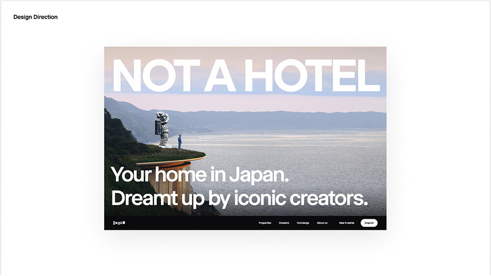 ProtoPieでつくられたプロトタイプは、Webサイトの体験を劇的に可視化した。ファーストビューではNOT A HOTELのロゴが大胆に表示され、「Your home in Japan. Dreamt up by iconic creators.」というミッションがアイコニックに示される。