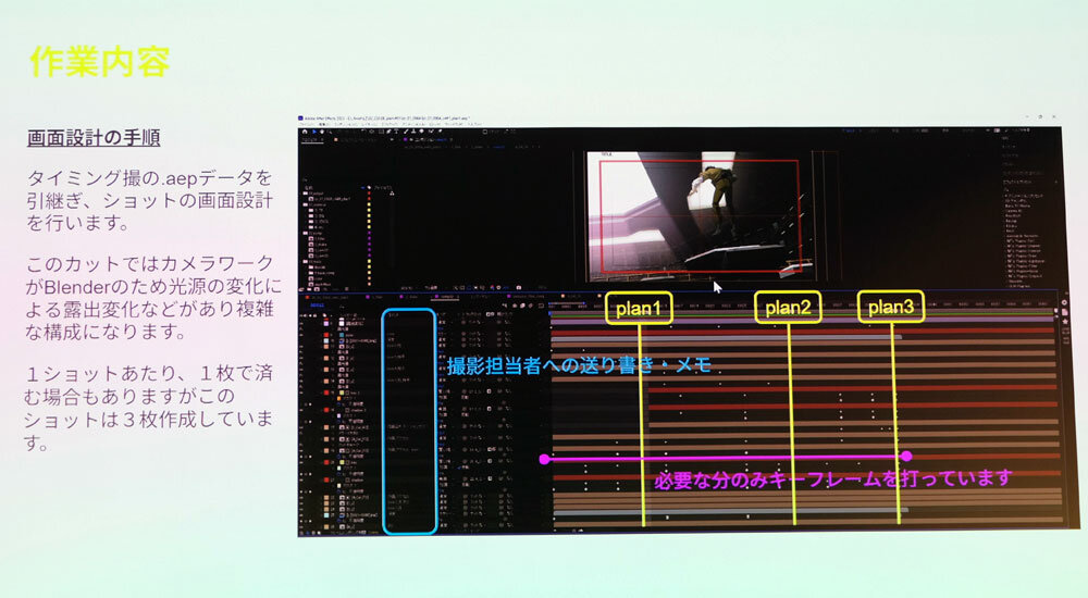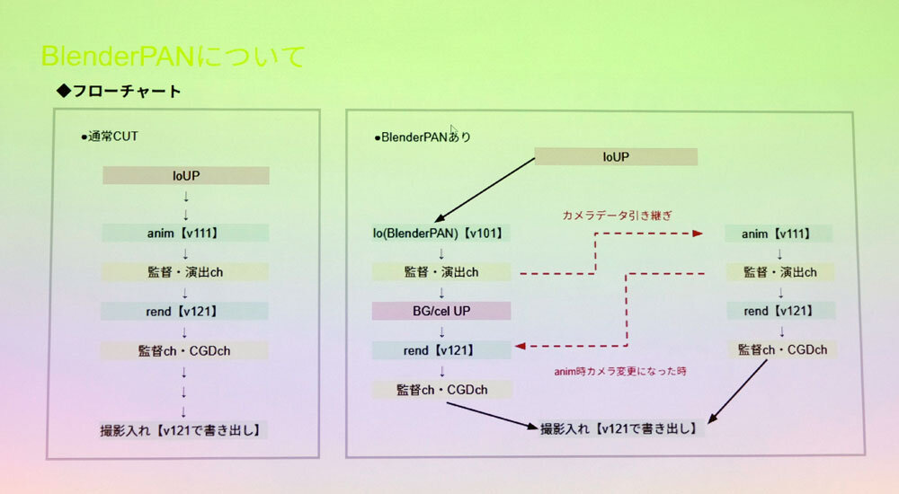 本作ではBlenderPANに専任の担当者を立てて、1人が一括して作業する体制を整えた。ただし同一カット内で3Dモデルにアニメーションを付ける場合、そちらは別のスタッフが担当するため、結果として複数の作業者が同じカットに関わることになる。人為的なミスを防ぐため、通常のワークフローとは別に、BlenderPANのパターンフローを作成し、作業手順を明確化した。