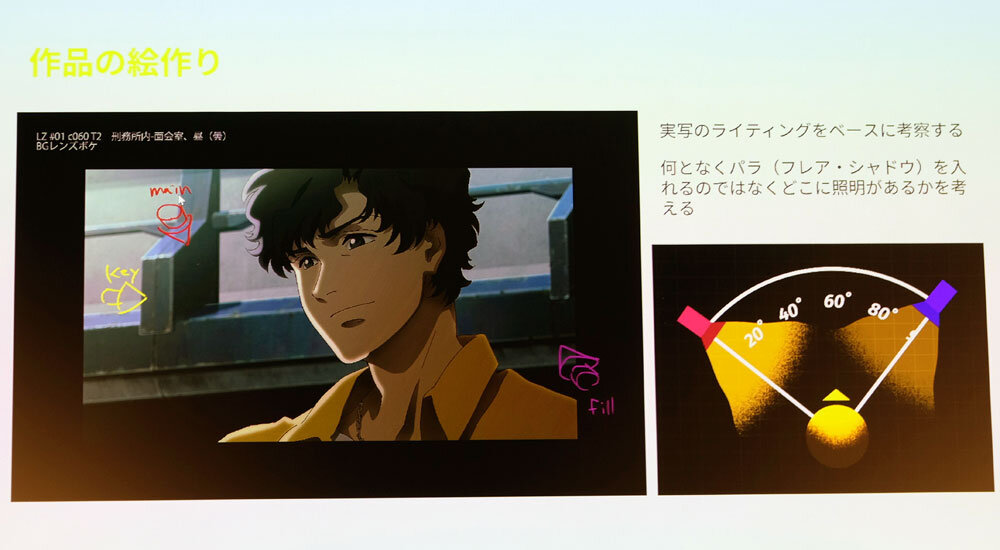 こういった丁寧な仕事によって、カット頭ではキャラクターの顔が影で潰れているが、カット尻では表情が少しだけ伺えるようになるといった、光の設計を実現することができた。